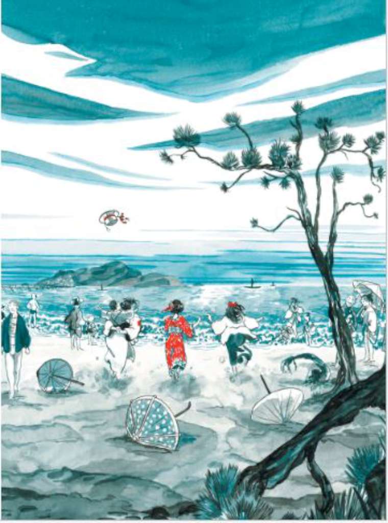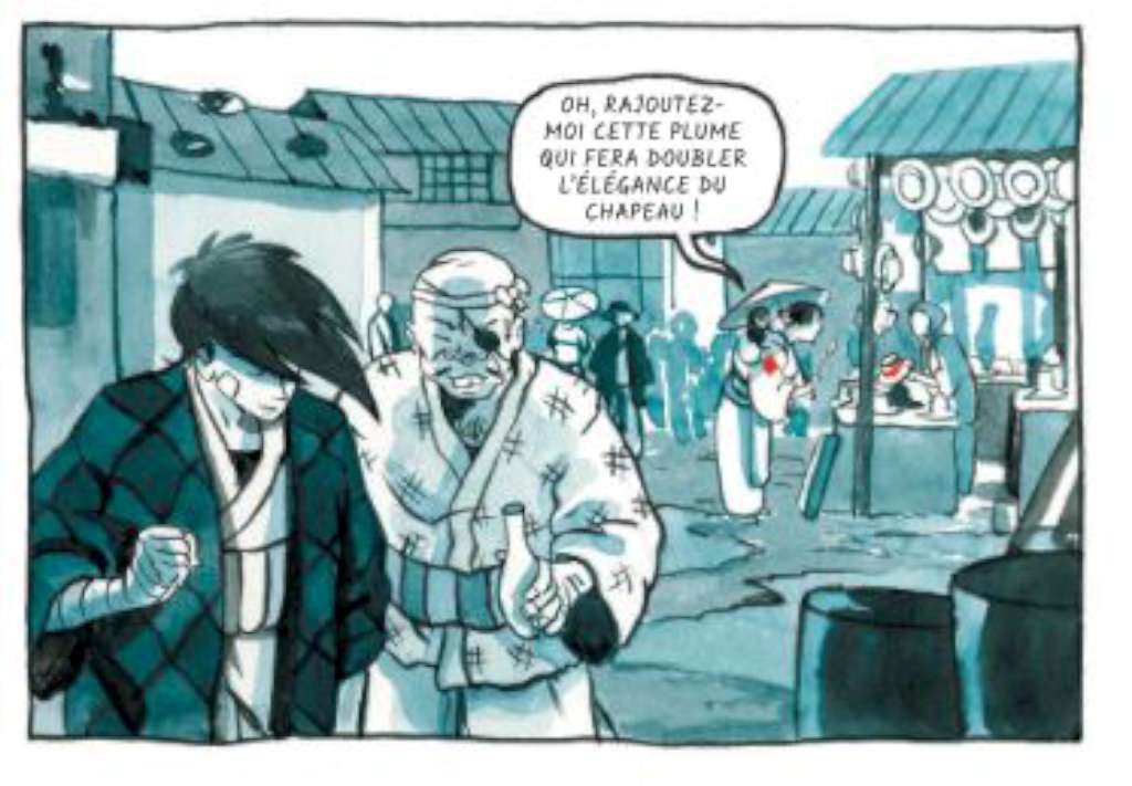 Ses compositions de planches et ses larges panoramas sont autant de citations de « vues » du Japon et son choix de lavis en bichromie délicate (bleu et pointes de rouge) est également un clin d’œil à la palette d’Hokusai et au bleu de Prusse qu’il utilise notamment dans les « 36 vues du Mont Fuji ».