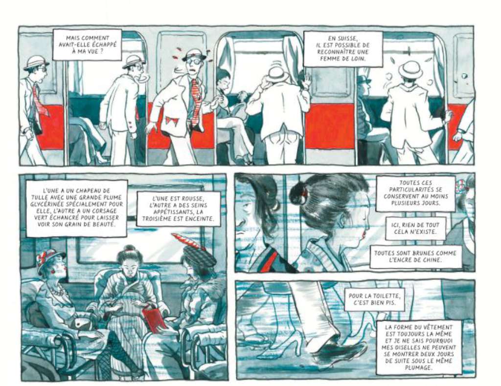 Comme dans « Tailleur pour dames », en effet, le protagoniste (qui n’a pas de nom dans le roman mais s‘appelle … Raucat dans la BD) ne peut mener à bien son désir de conquérir la jeune Fumiko car il est sans arrêt interrompu par des fâcheux au premier rang desquels l’industriel du savon Satô Daisuke. Les planches d’ouverture soulignent comme dans « Le Dindon » ou « Un fil à la patte » que les personnages se croisent, se manquent, se courent après.