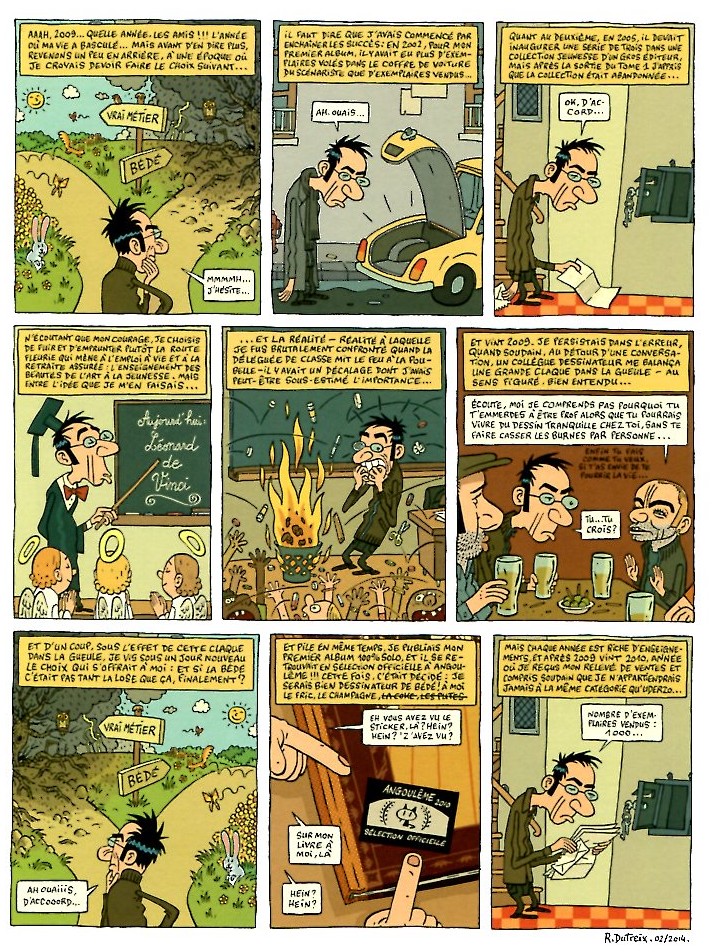 Je ne pense pas que ça l’ait vraiment nourri parce que je pense vraiment que c’est deux disciplines totalement différentes. Ce que ça a pu m’apporter, je ne sais pas si ça se transpose dans la bande dessinée mais en tout cas j’ai vraiment eu l’impression d’apprendre un nouveau métier donc je pense que ce que ça m’a appris peut-être c’est à organiser différemment mon travail tout simplement pour pouvoir justement faire les deux parce que moi j’ai besoin de faire les deux. C’est vrai que si je ne fais qu’un seul des deux, l’autre me manque et il faut que les deux soient une respiration. C’est bien si l’un peut être une respiration pour l’autre et pas un handicap en fait. Et pour ça il faut vraiment réussir à équilibrer les deux.