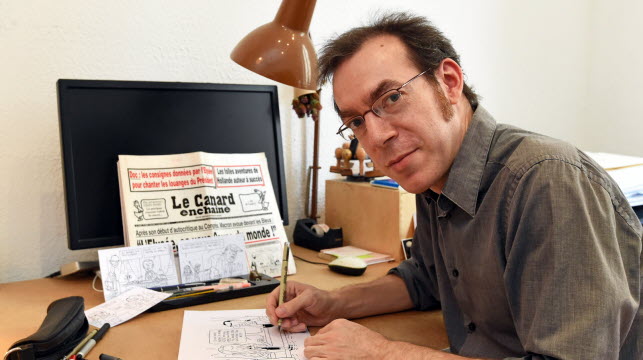 Oui ce qui c’est passé justement c’est que mon précédent bouquin était sorti début 2018 et c’est à ce moment-là que je suis arrivé au Canard effectivement et il m’a fallu un certain temps pour apprendre à concilier les deux professions. Ce sont deux professions tellement différentes. C’est-à-dire que la bande dessinée, c’est de la course de fond, c’est comme un travail de moine copiste. Pendant des mois et des mois vous êtes sur une lancée, un rythme continu. Il ne faut surtout pas vous arrêter en fait vous êtes sur un rythme continu, un travail régulier de fond quoi. Le dessin de presse, c’est l’inverse. C’est du sprint en fait. En plus pour vous extraire de cette bulle dans laquelle vous avez besoin de vous mettre quand vous êtes sur un travail de bande dessinée – surtout une histoire longue comme ça, un album entier à faire – vous ne regardez plus la télé, vous ne suivez puis l’actu. Moi avant de travailler au Canard, je ne suivais pas vraiment l’actualité quand j’étais dans une ambiance de concentration comme ça. Et là le dessin de presse ça vous oblige toutes les semaines à vous extraire de ça et puis prendre l’actualité dans tout ce qu’elle a d’immédiat, de frénétique.