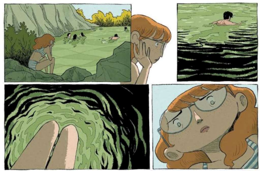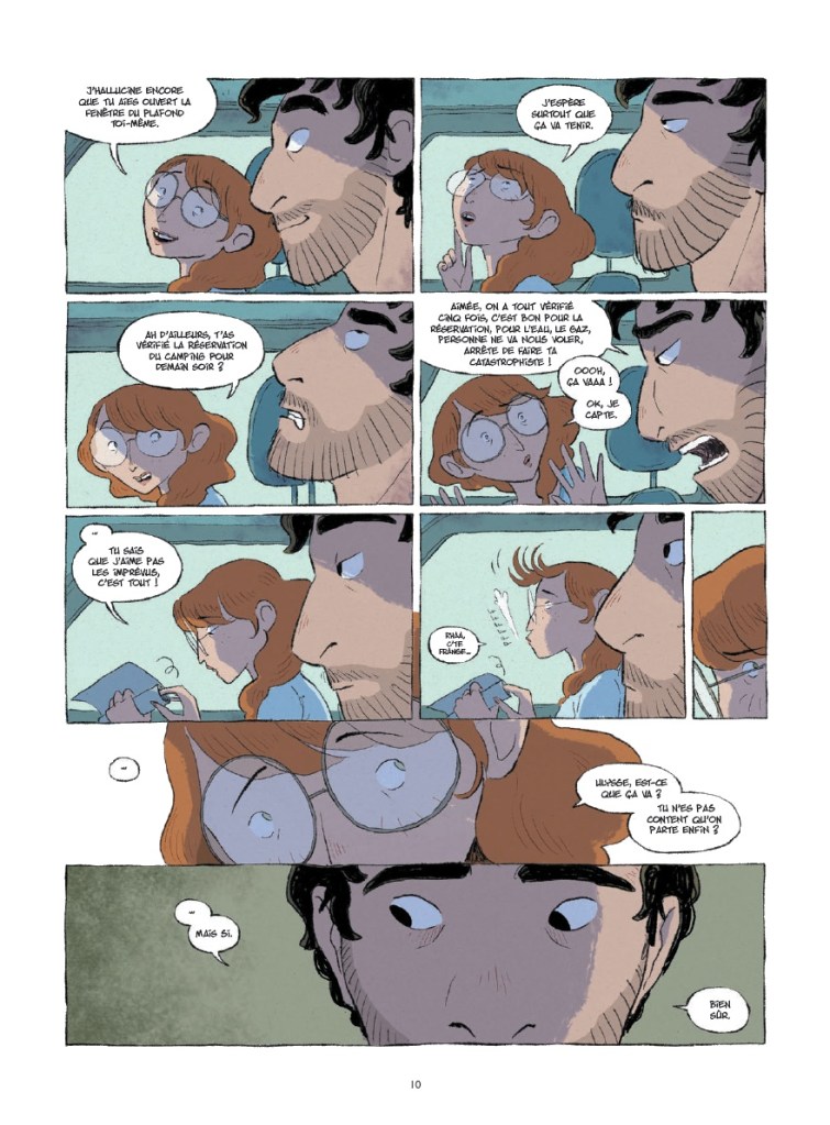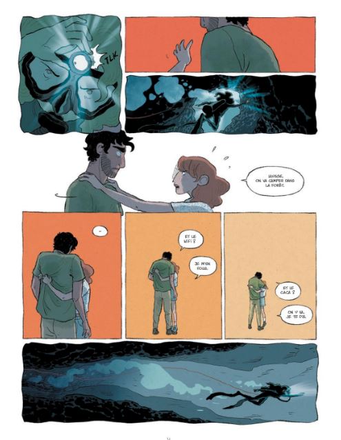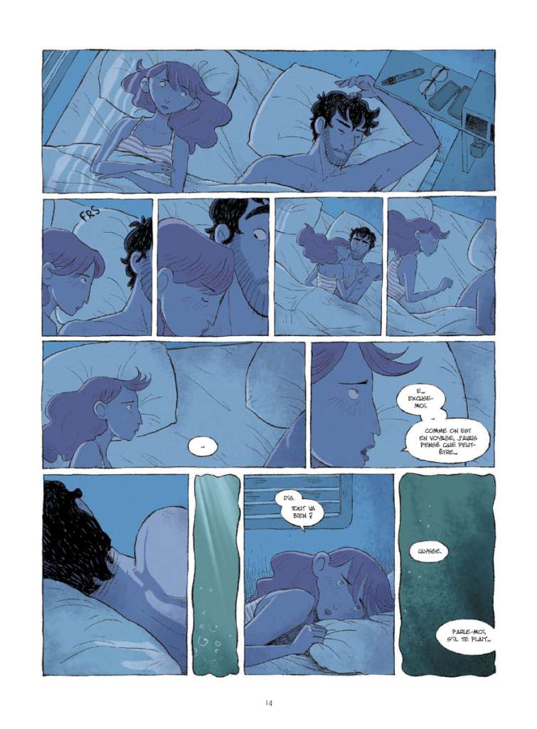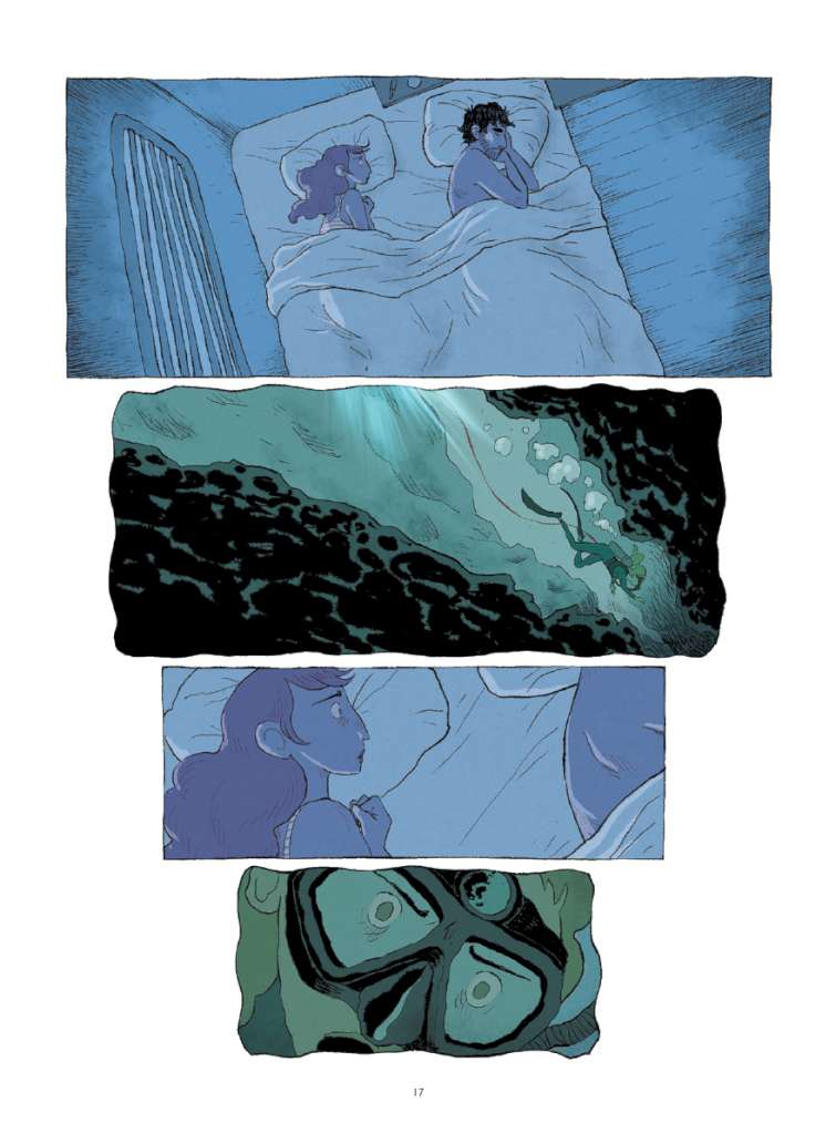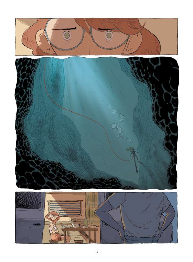 Jaraba joue aussi avec beaucoup d’intelligence du huis-clos qu’est le van aménagé et s’en sert comme d’une métaphore pour montrer comment l’habitude et la routine dans un couple peuvent devenir prison et créer un sentiment de claustrophobie chez Ulysse. Afin de « représenter » concrètement les angoisses d’Aimée, elle met également en place des « flashs » intrigants qui viennent interrompre le récit à certains moments clés (lors d’une dispute par exemple) dans lesquels Aimée plonge au fil des cases dans une grotte sous-marine obscure et de plus en plus étroite. On ne saura qu’à la fin du récit si ces cases représentent une situation réelle, fantasmée, ou bien seulement une métaphore filée mais, comme le huis clos, ces passages récurrents permettent de dramatiser le récit et évitent une narration trop linéaire. Le découpage innovant et hors des cases illustre également, à sa manière, cette histoire d’émancipation.
