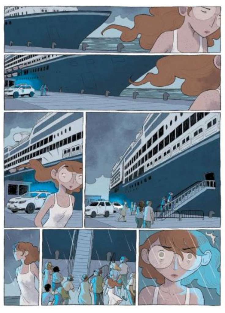 Elle joue aussi avec brio des variations de couleur : le rouge et l’orangé venant dans les moments de tension « trancher » sur le camaïeu pastel à dominante jaune et bleu (comme la mer et le sable). Un grand nombre de pages sont muettes et les sentiments et émotions passent donc davantage par le dessin que la narration.