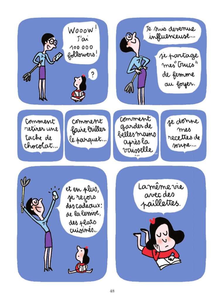 L’histoire inaugurale est de Florence Dupré-Latour ; là aussi cela fait sens. Parce qu’elle est née à Buenos Aires peut-être ? Mais surtout parce qu’elle déplorait dans son autobio-graphique « Pucelle », combien dans la bande dessinée et la littérature les représentations féminines sont stéréotypées : Falbala, Bonnemine, La Castafiore, Chihuaha Pearl ou encore Constance Bonacieux sont des « êtres fades, rares et secondaires à peine esquissés, relégués dans le silence, le décor ou des positions subalternes » (tome 1 p.100). Ici elle déclare au contraire « Mafalda, c’est moi ! ». Elle se met doublement en scène : enfant avec son amie imaginaire Mafalda qui lui sert de modèle émancipateur mais aussi dans son quotidien d’autrice et de femme adulte où Mafalda par les questionnements qu’elle engendre permet de faire un bilan sur notre monde actuel.