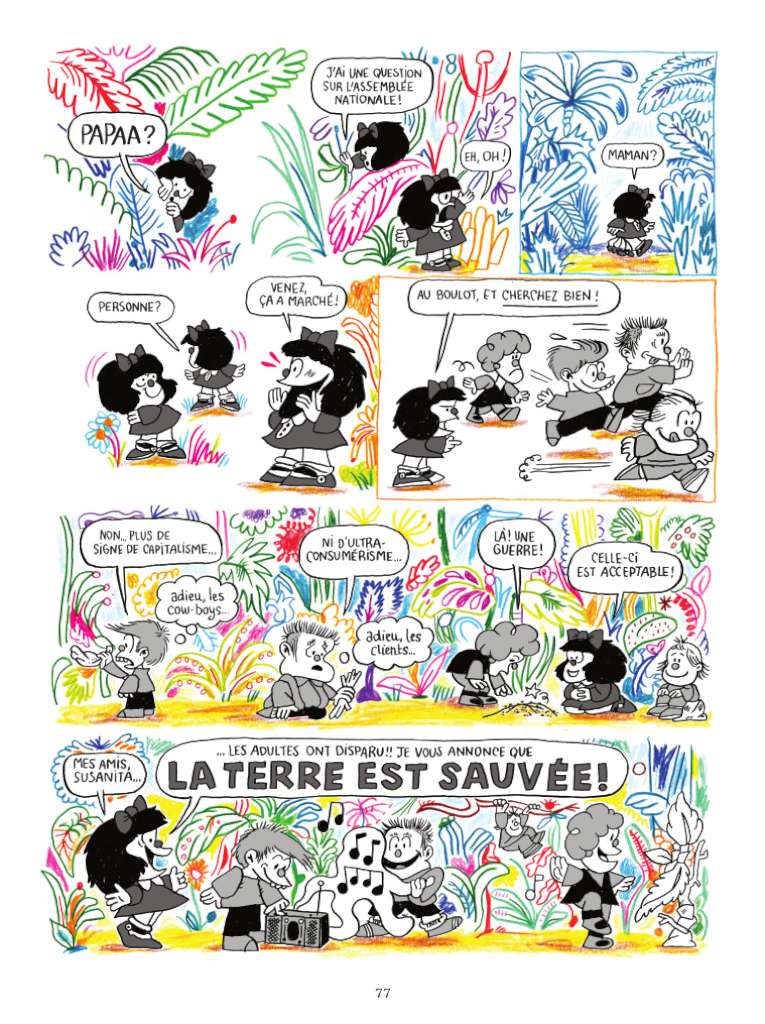 Si les histoires d’Anne Simon, Gally & Vaiente se déroulent dans une temporalité indéterminée, la majorité des participantes a choisi de « déplacer » les histoires de Mafalda à l’époque actuelle ce qui est savoureux parfois. On s’amuse de découvrir ainsi que Susanita est devenue influenceuse tandis que Manolito est épicier bio chez Véro Cazot & Maud Begon par exemple.