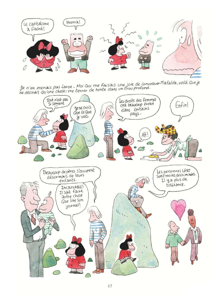 Ce qui est intéressant également c’est que seule Aude Picault s’astreint à reprendre le noir et blanc d’origine et à faire « du Quino » dans sa représentation des personnages avec les mêmes gimmicks quand Mafalda doit par exemple avaler la soupe qu’elle abhorre.