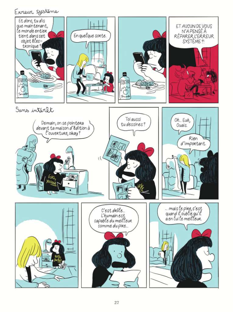 L’ouvrage se poursuit avec une nouvelle histoire en dix pages de Maëlle Réat, jeune autrice qui monte. Elle aussi met en scène sa rencontre imaginaire avec Mafalda qui y trouve d’ailleurs une nouvelle cause d’indignation : le statut précaire des auteurs de BD ! La dessinatrice reprend avec bonheur des codes et objets des strips originaux : quand la Mafalda des années 70 piquait les crèmes de beauté de son amie Susanita pour embellir le monde en en étalant sur son globe, dans la version moderne la fillette tente de faire avaler à ce dernier un des anxiolytiques de Maëlle pour qu’il aille mieux. La dessinatrice utilise aussi à plusieurs reprises le strip en trois six ou neuf cases auquel elle donne un titre « Époque », « erreur système » … et surtout une punchline finale, format qu’adopte également Anne Simon.