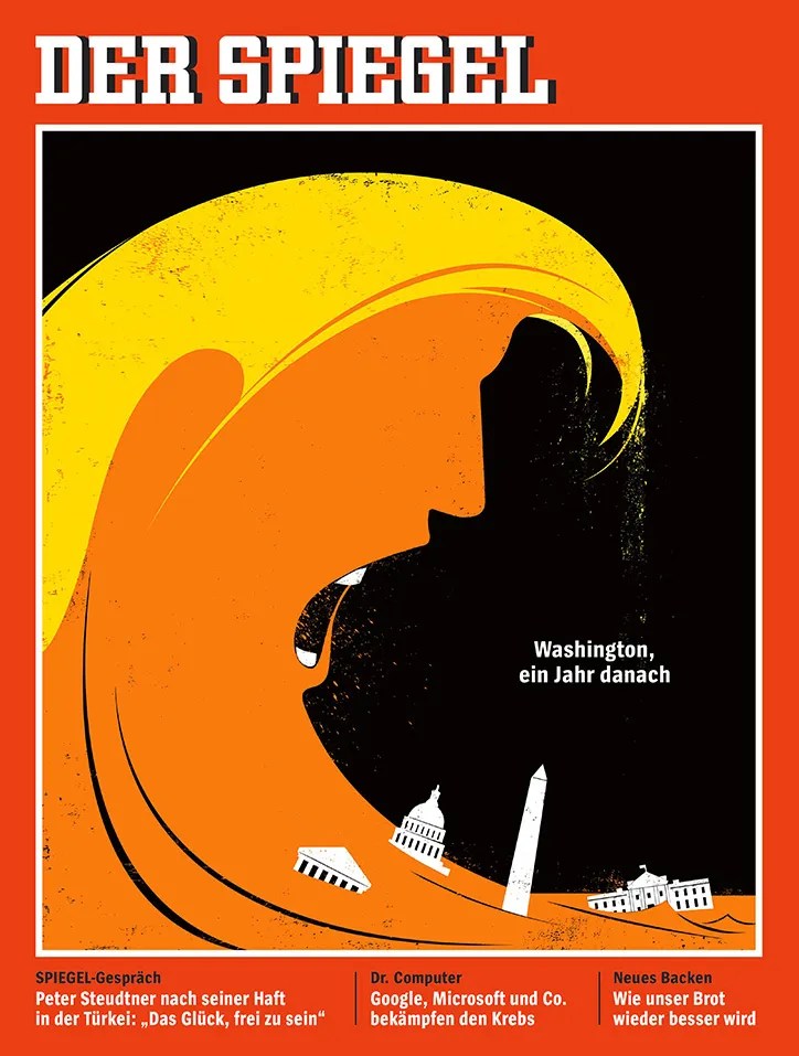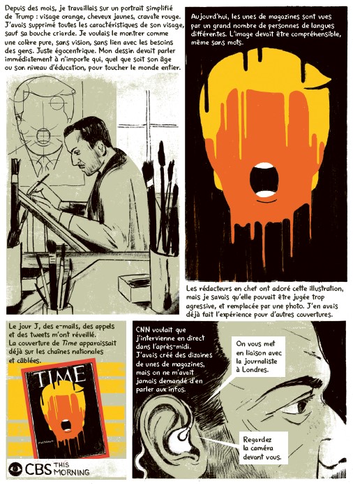 Tour à tour flamme, vague déferlante, météorite prête à percuter la Terre, Cerbère à trois têtes ou visage se liquéfiant pour marquer l’effondrement des États-Unis, nombre de ces illustrations vont faire la couverture de prestigieux magazines.