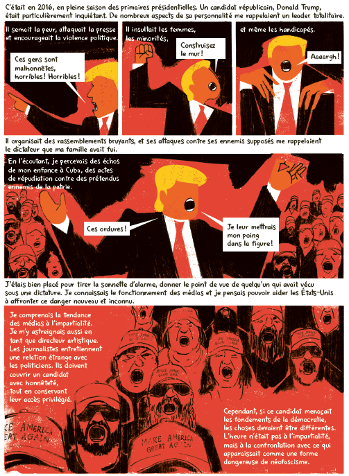C’est à ce moment-là, que profitant de l’espace de liberté qu’offre Internet et les réseaux sociaux, il décide de poster des caricatures de Donald Trump faisant ainsi résonner sa propre voix sans l’interférence du regard extérieur d’un comité de rédaction et qu’à cette première partie consacrée à son enfance cubaine et à sa vie d’émigré aux États-Unis, il va ajouter une seconde en établissant le parallèle entre Fidel Castro et Donald Trump : populisme, vociférations, incitations à la violence lors des discours, méfiance vis à vis la presse considérée comme l’ennemi du peuple, manipulation de l’information …