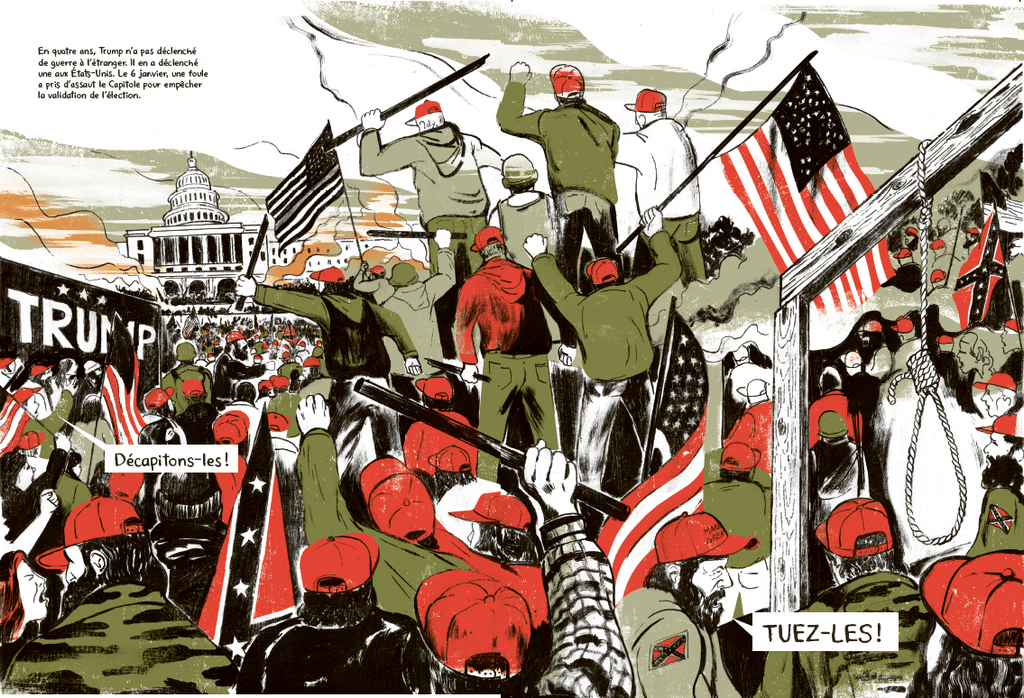 Ces deux planches en miroir, la première représentant l’entrée des guérilleros à la Havane en 1959 ouvrant le récit, la seconde (pages 284-285) l’assaut du Capitole par les partisans de Trump coiffés de casquettes MAGA le 6 janvier 2021 suite à sa défaite à la présidentielle sont particulièrement percutantes.