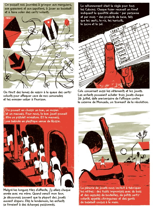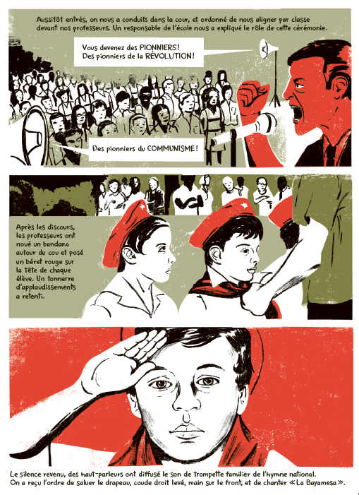 Jeux dans les champs de canne à sucre, fierté de porter le béret rouge lors de son entrée à l’école…, À ses souvenirs se mêle d’une part la doctrine autocrate et liberticide du parti : propagande, culte de la personnalité, muselage de la presse, endoctrinement des jeunes Cubains, futurs soldats de la révolution qui à l école apprennent à lire dans un manuel à la gloire de Fidel et saluent le drapeau main sur le front en entonnant la Bayamesa, et d’autre part l’impact sur la population : privation de liberté, rationnement, pénurie de nourriture, de médicaments, peur constante d’une dénonciation.