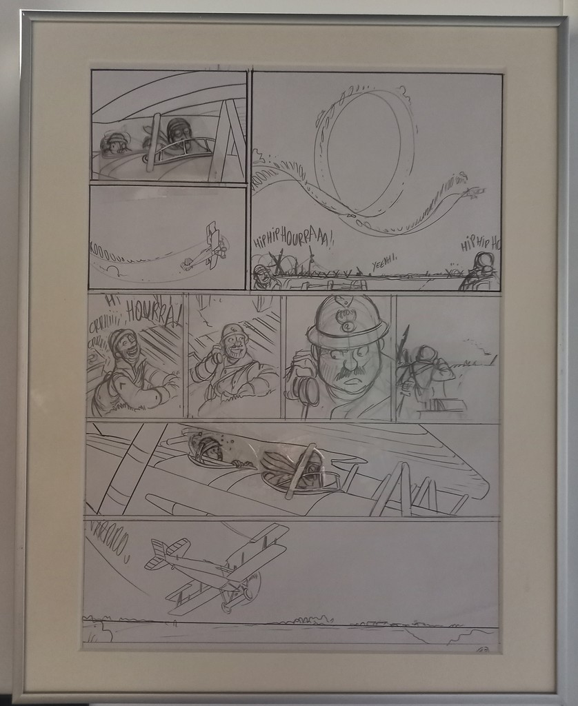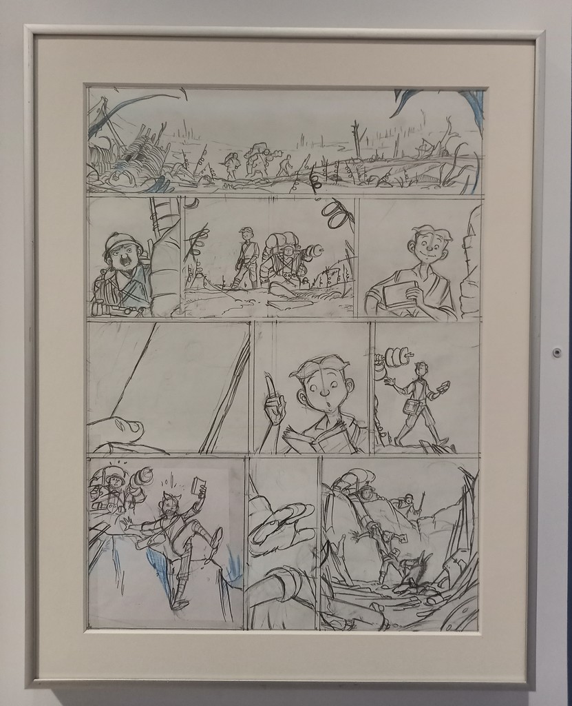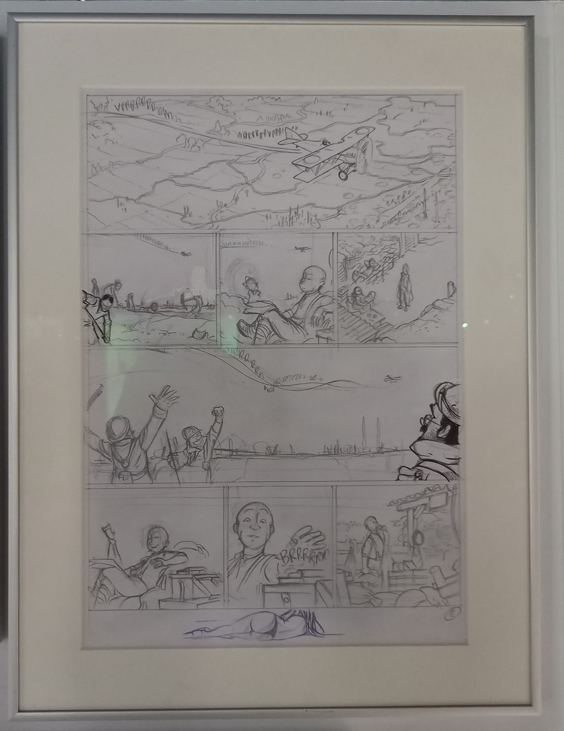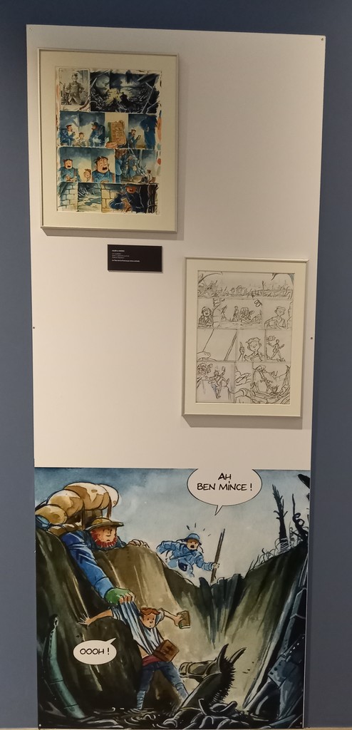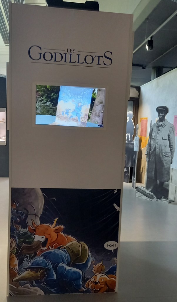 Si l’on n’excepte le panneau mural ci-dessus, à l’instar de la série Airborne 44, les planches originales, croquis préparatoires et autres étapes intermédiaires de la série jeunesse Les Godillots sont exposés sur des colonnes et regroupés par thème.