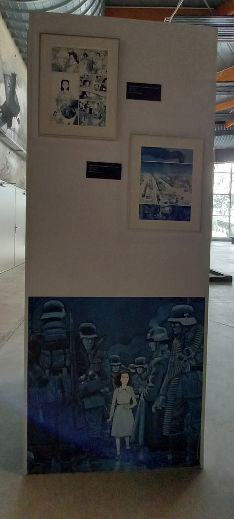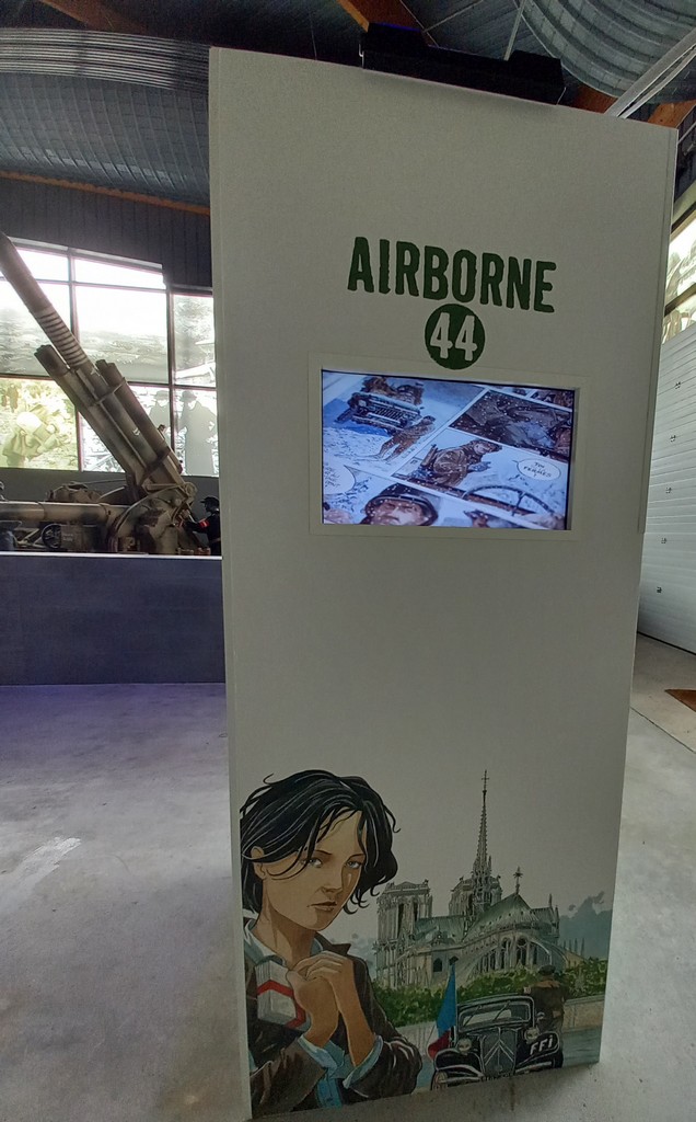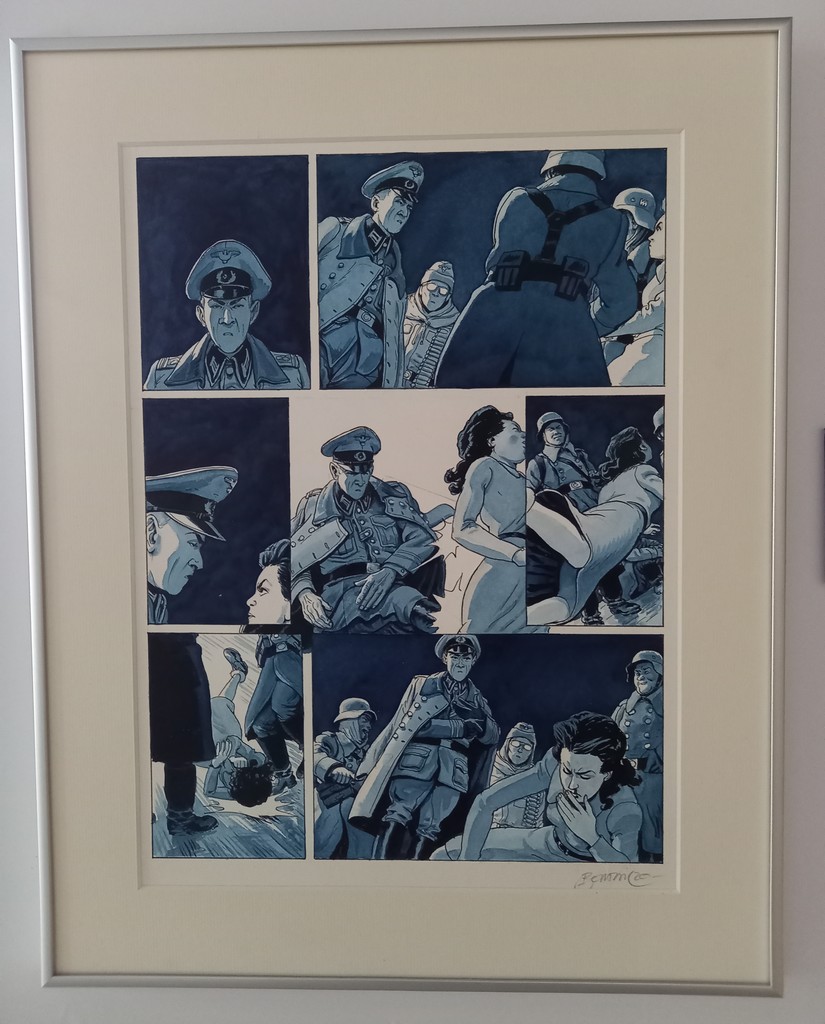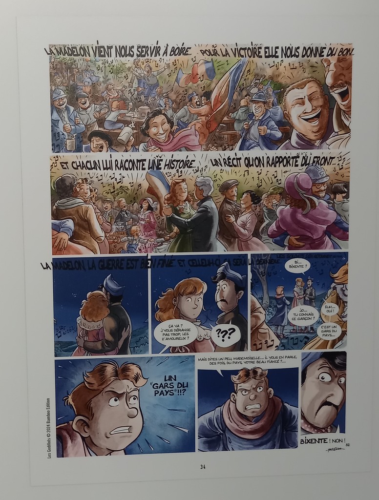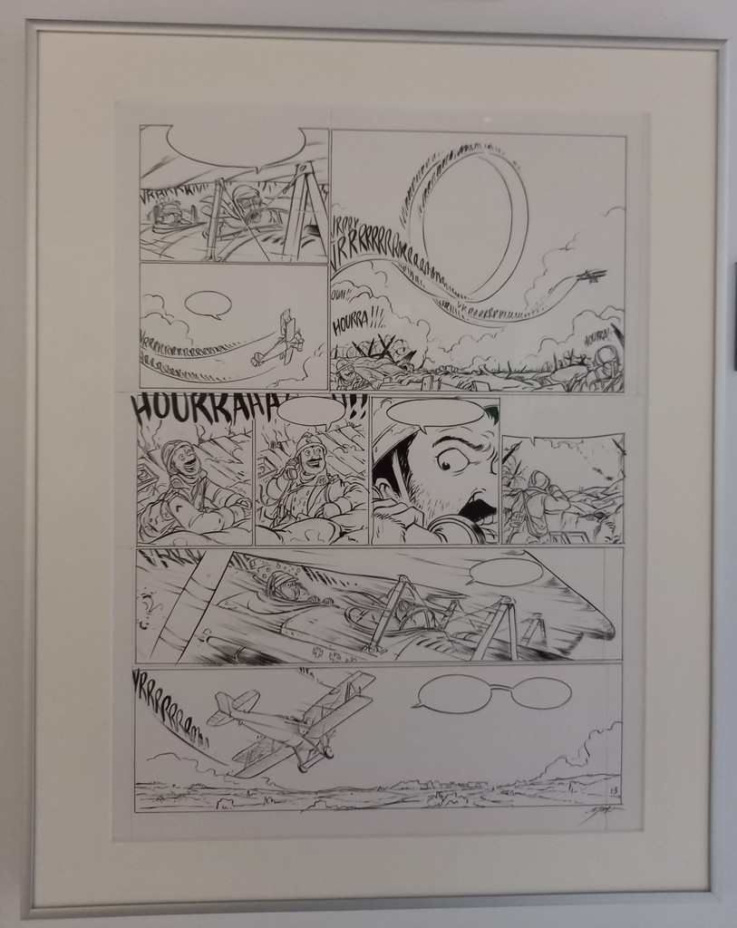 Si l’on n’excepte le panneau mural ci-dessus, à l’instar de la série Airborne 44, les planches originales, croquis préparatoires et autres étapes intermédiaires de la série jeunesse Les Godillots sont exposés sur des colonnes et regroupés par thème.