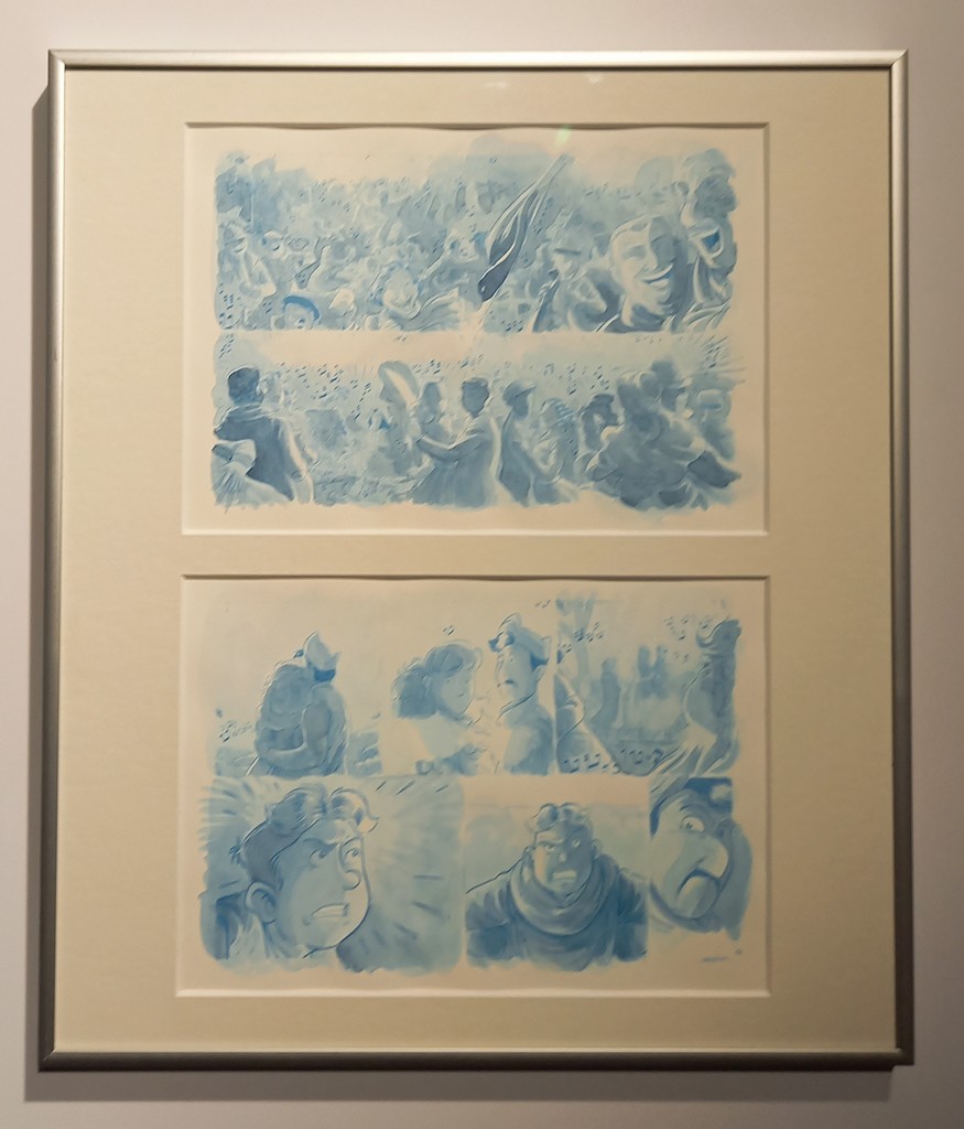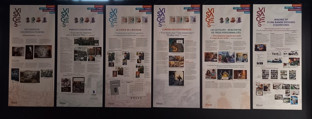 Cette exposition ne comprend pas de planches originales mais des panneaux didactiques sur l’élaboration et les différentes étapes de création d’une bande dessinée.