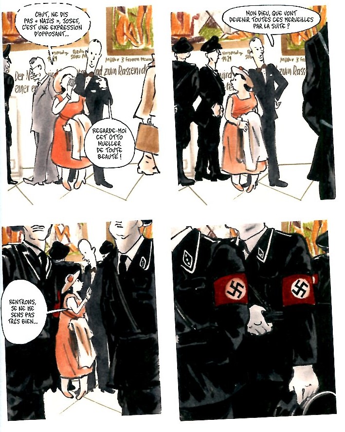 Au cœur de cette exposition le tableau et donc le lecteur, verra défiler une foule de visiteurs anonymes mais également de hauts dignitaires du parti tels Goebbels et Hitler lui-même. Si certains le qualifiaient de « Saloperie pornographique », d’autres en revanche férus d’art moderne conscients que c’était sans doute la dernière fois qu’ils pourraient admirer ces œuvres y voyaient « un Otto Mueller de toute beauté ».
