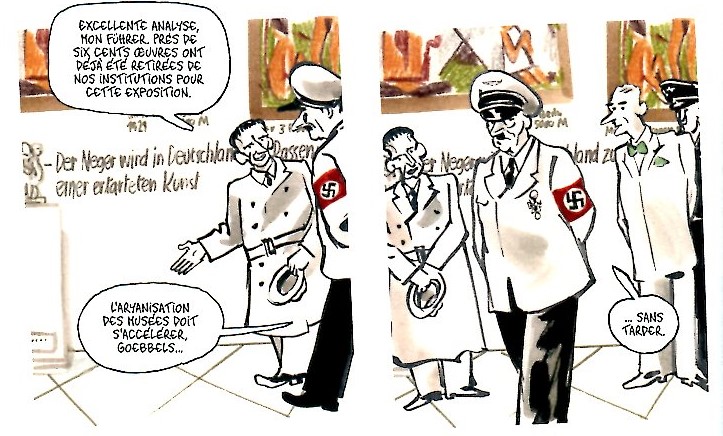 Une grande partie du récit extrêmement bien documentée est consacrée à la tristement célèbre exposition « Art dégénéré ». À Munich, en 1937, deux grandes expositions antinomiques se font face : l’une à la gloire de l’art aryen au tout nouveau musée « La maison de l’art allemand », l’autre réunissant dans le petit institut archéologique quelques 650 œuvres d’art moderne qui « ne reproduisaient pas le beau, le vrai, le précis, le purement figuratif» donc non conformes à l’esthétique du IIIe Reich.