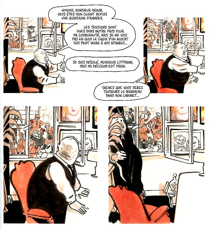 Cela commence dans le bureau d’Ismar Littmann. Le tableau fait en partie face à la fenêtre. Aussi en arrière-plan, va-t-on voir la montée inexorable de l’extrême droite – affiche d’Hindenburg remplacée par celle d’Hitler, défilés de SA – et des actes antisémites commis notamment à l’encontre de Monsieur Klein, le propriétaire de la boutique située de l’autre côté de la rue. Et ce sont ces détails qui n’en sont pas qui mieux que de longs discours reconstituent l’époque.
