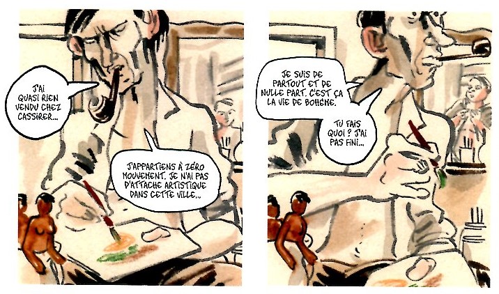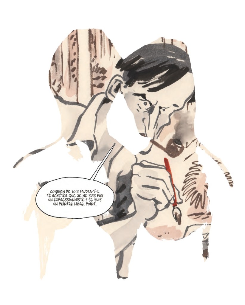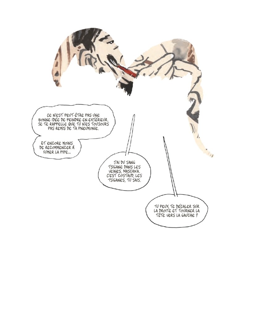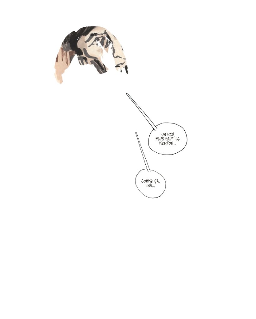 Peu à peu, nous comprenons que nous sommes en train d’assister à la naissance du tableau Deux filles nues mais alors que nous nous attendons à voir ce tableau, surgit à l’intérieur des silhouettes esquissées un homme au visage émacié, pipe aux lèvres et pinceau à la main. Et on saisit alors que l’on voit, non pas le tableau mais ce que le tableau voit. Nous voilà transportés au cœur même du tableau. Notre champ de vision sera le sien.