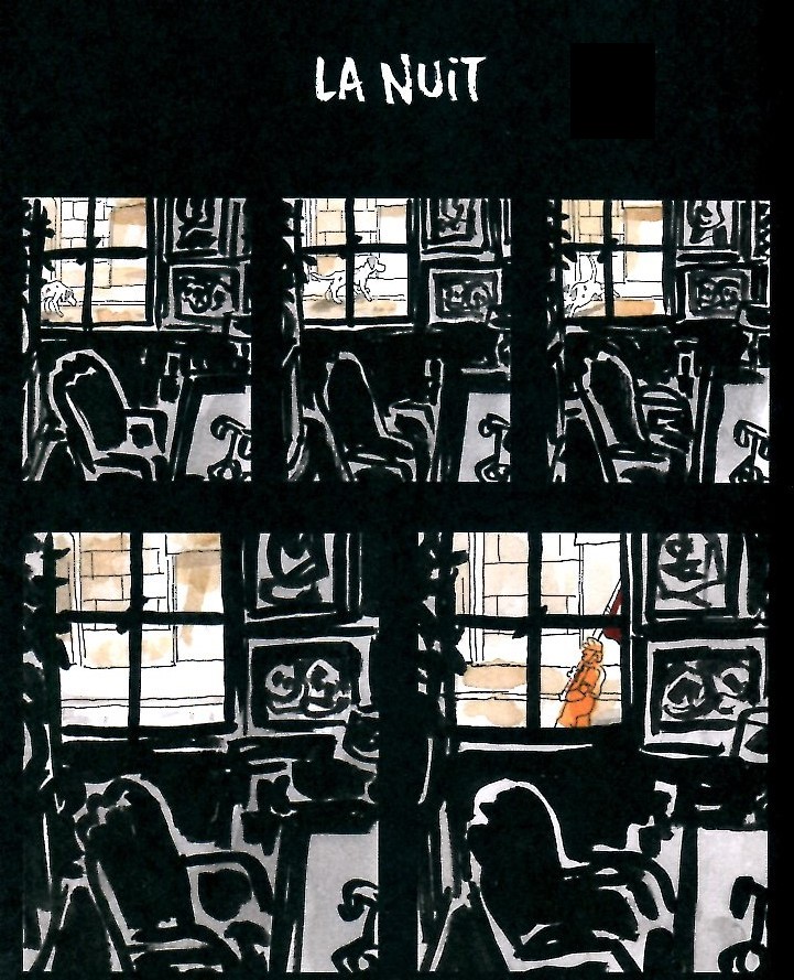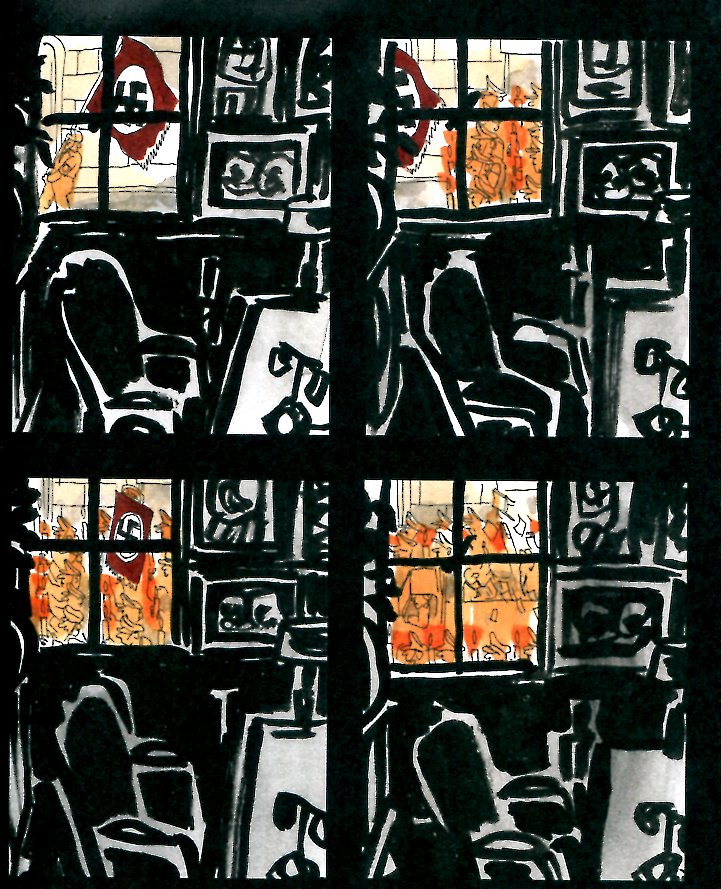 Bien que le tableau original ait été réalisé à la détrempe et de ce fait n’était pas vernis, Luz a voulu nous donner une vision du monde vue par le prisme d’un tableau comme si on voyait à travers son vernis. En découlent ses choix graphiques de la couleur directe et du lavis avec une gamme chromatique liée à l’époque : des tons désaturés où dominent le sépia, l’orangé, le brun et le vert. Et puis il y a le noir, noir des uniformes SS et surtout noir de la nuit …