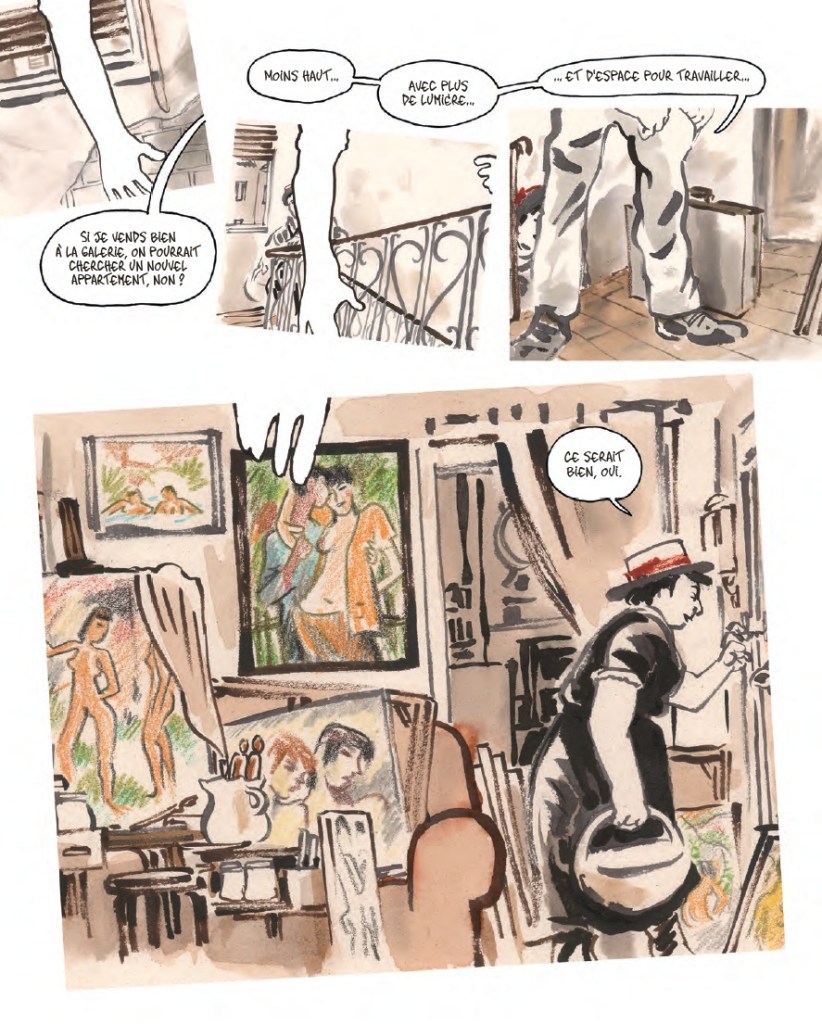 Pour la reproduction des tableaux que notre tableau ne cessera de croiser, dans l’atelier du peintre, lors des transports ou dans les expositions et musées, il délaissera l’encre au profit des crayons de couleur et usera de couleurs plus vives, plus soutenues. Les crayons de couleur étant par excellence l’outil des enfants, il s’est plu à imaginer que « les tableaux se repèrent, se contactent à travers une espèce d’innocence qu’ils portent en eux. »