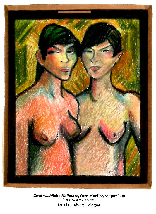Il y a un peu de Luz dans Otto Mueller, dans ce refus de se laisser enfermé dans des cases. Bien qu’ayant fait partie de Die Brücke – dont le nom évoque le pont entre l’art du passé et l’avenir – ce collectif né à Dresdes sous la houlette de Ernst Ludwig Kirchner de peintres un peu bohèmes critiques à l’égard de la société contemporaine qui désiraient rompre avec les conventions artistiques académiques, s’affranchir du beau et privilégier la subjectivité de l’artiste en exprimant leurs émotions lui, plus intéressé par l’harmonie entre les humains et la nature que le sociétal à travers notamment ses portraits de jeunes filles et de tziganes, est toujours resté un peu à la marge et revendiquant avant tout sa liberté, refusait qu’on lui colle une étiquette.