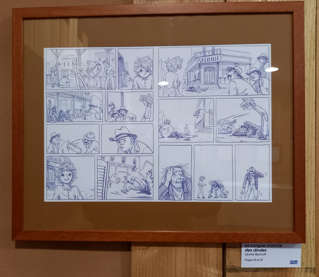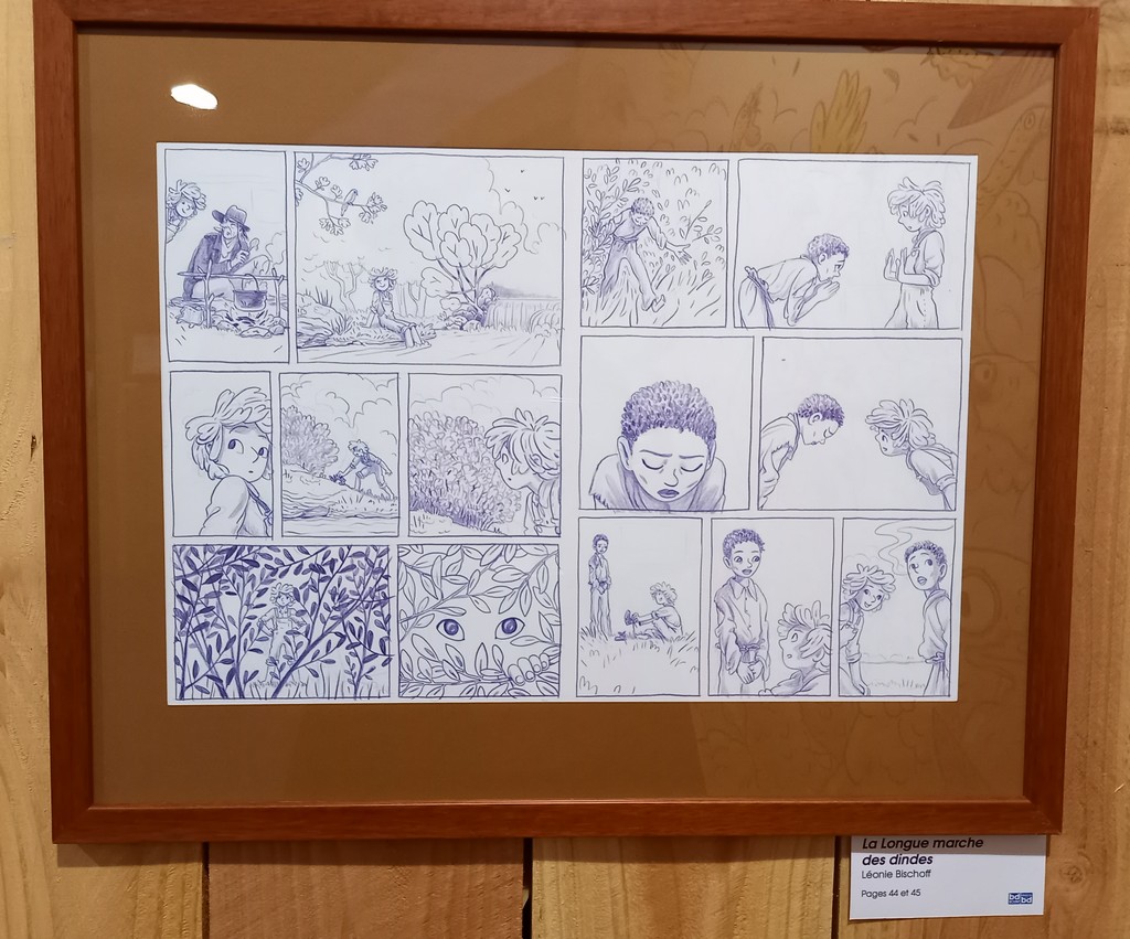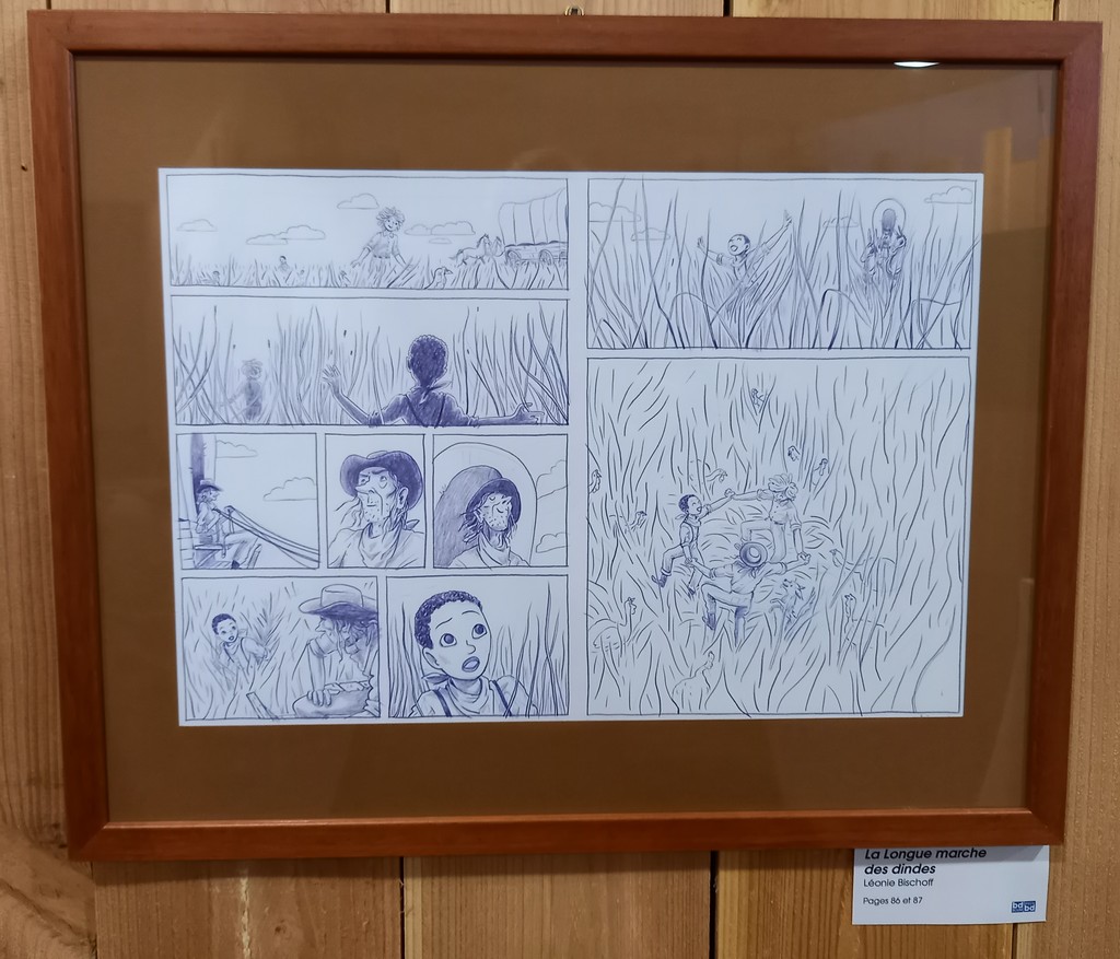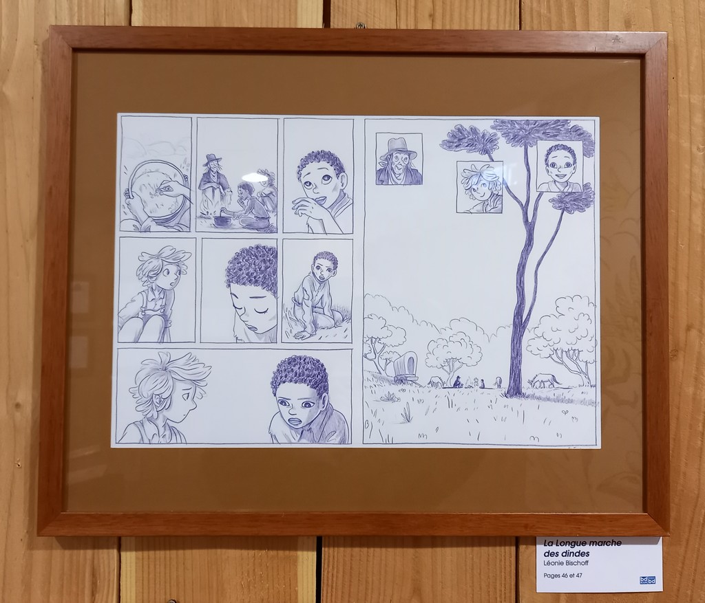 Qui dit expo bande dessinée, dit planches originales. Celles-ci sont en noir et blanc ou plus exactement en violet et blanc. Léonie Bischoff qui travaille en tradi a opté pour le trait violet qui va se décliner dans différentes nuances de violet voire de brun selon les atmosphères créées avec la couleur qui elle est réalisée numériquement.