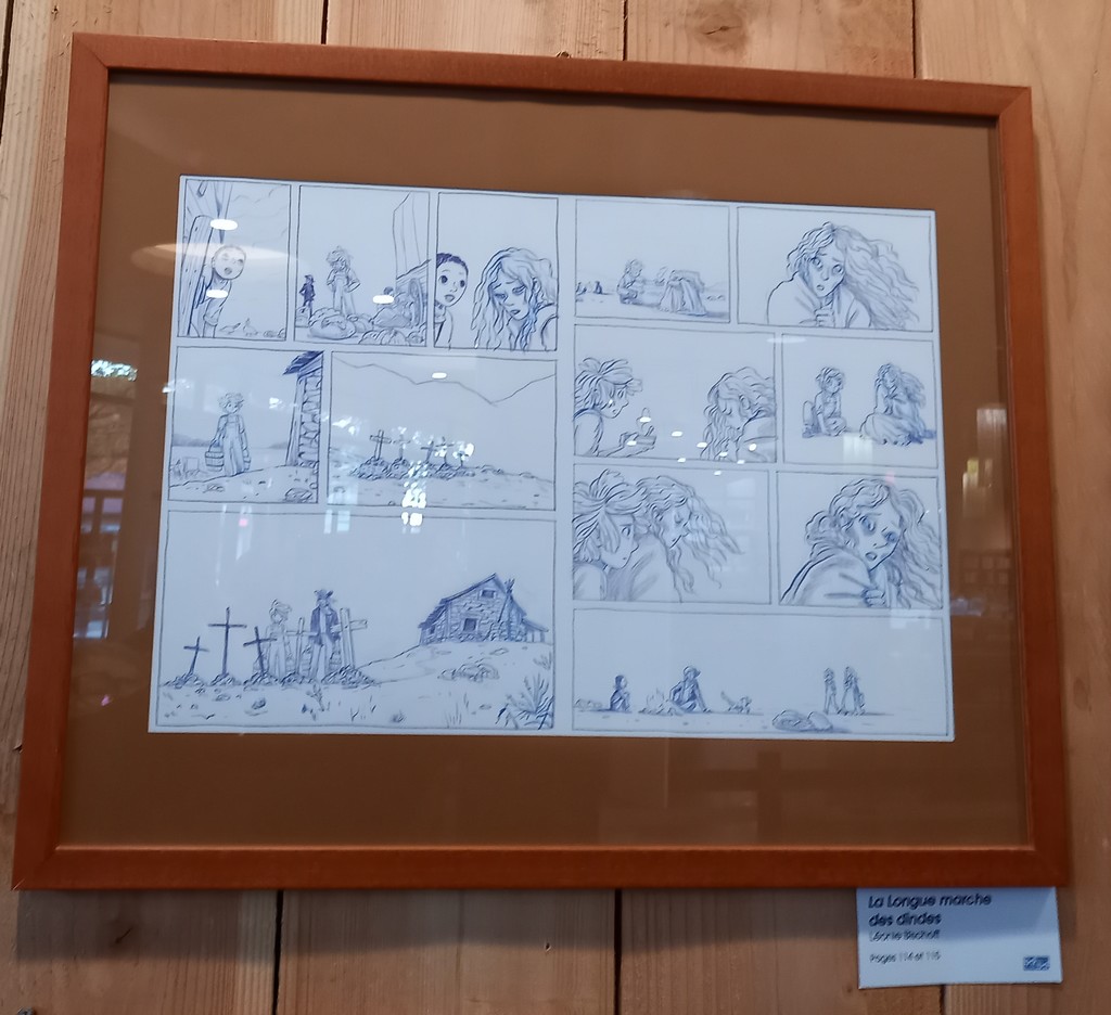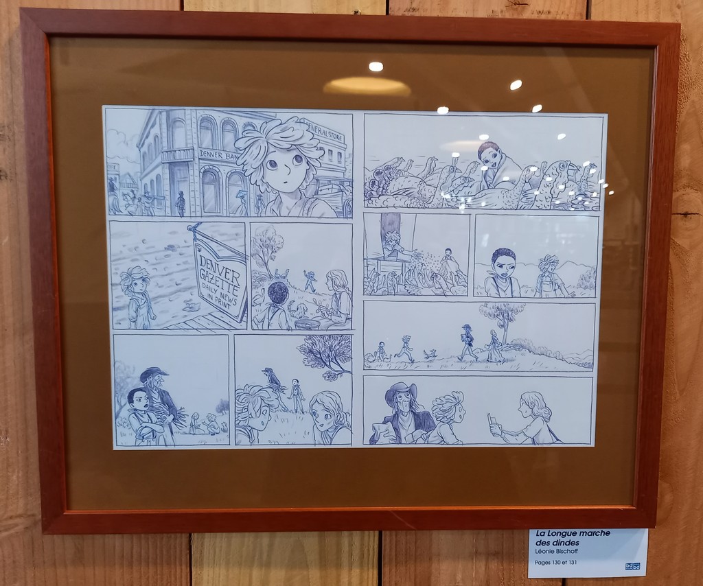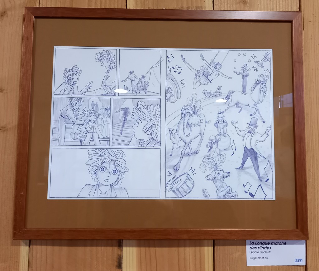 Qui dit expo bande dessinée, dit planches originales. Celles-ci sont en noir et blanc ou plus exactement en violet et blanc. Léonie Bischoff qui travaille en tradi a opté pour le trait violet qui va se décliner dans différentes nuances de violet voire de brun selon les atmosphères créées avec la couleur qui elle est réalisée numériquement.