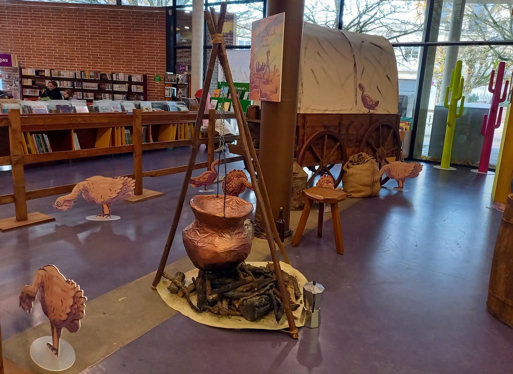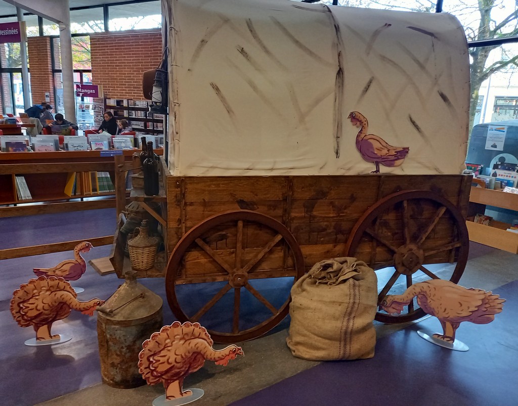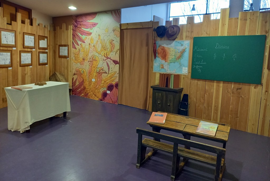L’exposition reproduit le décor de la salle de classe où l’histoire commence et va mettre en scène différentes étapes du voyage à travers le chariot, le feu de camp, sans oublier les dindes bien sûr …