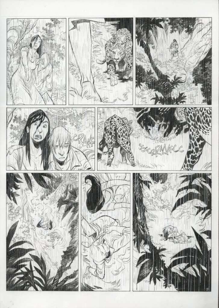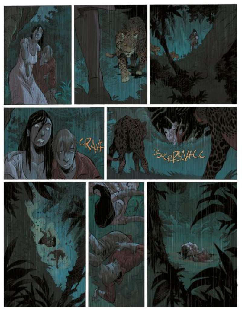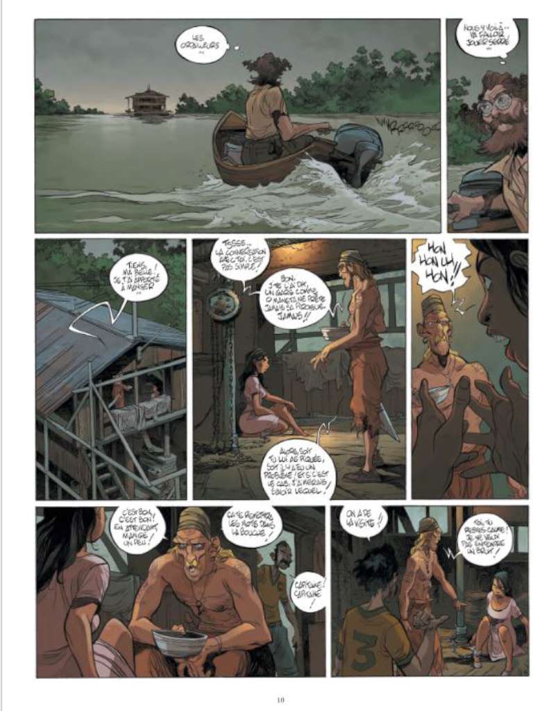OP : Il est vrai que j’ai tendance à toujours aimer poser une petite dose de fantastique pas dans tous mes projets mais j’aime bien que cette incursion de choses qu’on ne voit pas qui ne sont pas présentes et qu’on peut ressentir…auxquelles je crois pas forcément mais j’aime toujours bien ces idées là. En effet en plus dans ce milieu là il y a toujours des croyances, une espèce d’imagerie autour des des sorciers indigènes, des esprits de la forêt, de tout ça et il me semblait que c’était une dimension intéressante. J’aime bien quand c’est minime, quand ça ne prend pas le pas sur la narration, mais cette dimension m’intéressait et donc il a fallu ramer un petit peu pour le convaincre ! Mais une fois qu’il a accepté l’idée, et qu’on a commencé à lui donner corps, ça fonctionnait.