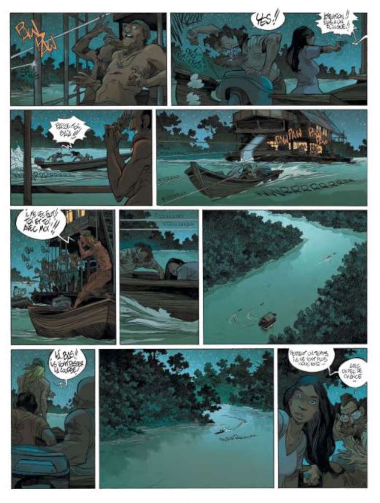 OP : Quand l’album vient de sortir je ne vois que les défauts en général mais oui ça c’est assez classique. En fait pour moi ce sont souvent les couleurs qui me font apprécier certaines planches comme par exemple la séquence de début de poursuite en pirogue avec Bahia et Rego; je l’aime beaucoup maintenant grâce aux couleurs qu’a apportées François : cette nuit avec les ciels étoilés. Chaque fois que je découvre ses couleurs je lui dis qu’il magnifie les choses réellement et je ne dis pas cela pour le flatter. C’est vrai !