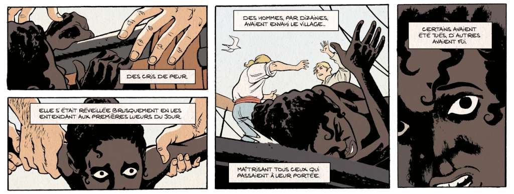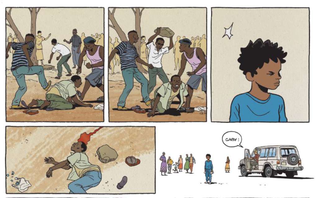 Lorsqu’on aborde la violence du génocide, il n’y a aucune séquence suivie. Ce sont des instantanés, des images quasi fixes, comme si on avait pris des photos de ces moments. Il n’y a pas de courses poursuites ni même de personnages qu’on retrouve d’une case à l’autre mais plutôt des images arrêtées qui sont quand même très fortes. Pour moi, ce qu’il est important de transmettre dans ces images là, c’es la soudaineté de la violence qui survient dans le quotidien des gens, sa proximité parce que c’est des gens qui se côtoient, et puis le fait que cette violence-là dégage une peur intrinsèque très profonde. J’avais envie qu’on sente cette peur des personnages, qu’on la ressente vraiment au plus profond de soi, plutôt que d’être dans l’image choc. Il y a quelques moments où on voit des coups de machette, des choses comme ça, mais assez peu en fait.