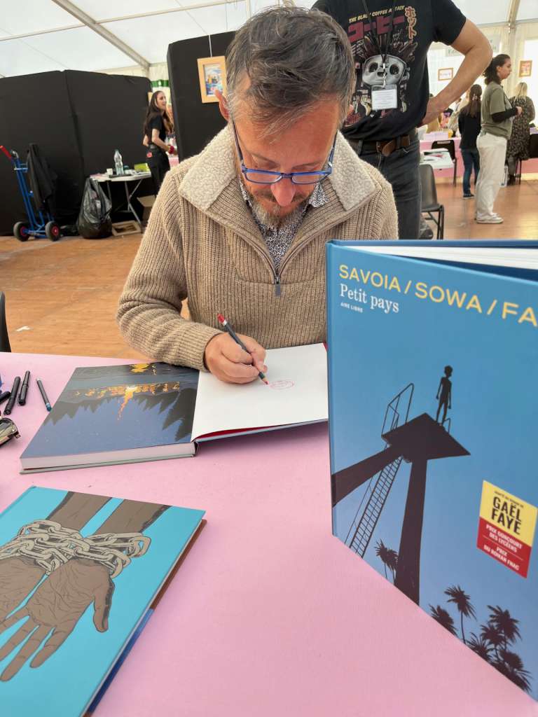 Alors effectivement c’est « d’après Gaël Faye » mais en même temps voilà c’est tellement son histoire, tellement son univers qu’on a adapté qu’il fait partie de ce livre intrinsèquement ! On ne peut pas dire qu’il n’y a pas participé ; il n’a pas fait l’adaptation mais il nous a accompagnés tout le temps. Il a relu le scénario, il nous a conseillés, je lui ai montré les planches au fur et à mesure. Il y avait quand même toujours cet échange permanent ! Quand j’avais des doutes, quand j’avais des questions sur la documentation, je les lui posais et il me répondait instantanément. Il m’avait même fait des petits croquis qu’il m’envoyait de Bujumbura depuis son téléphone, pardon de Kigali puisqu’il habite au Rwanda ! Donc vous voyez la proximité entre Gaby et Gaël … parfois je m’y perds !