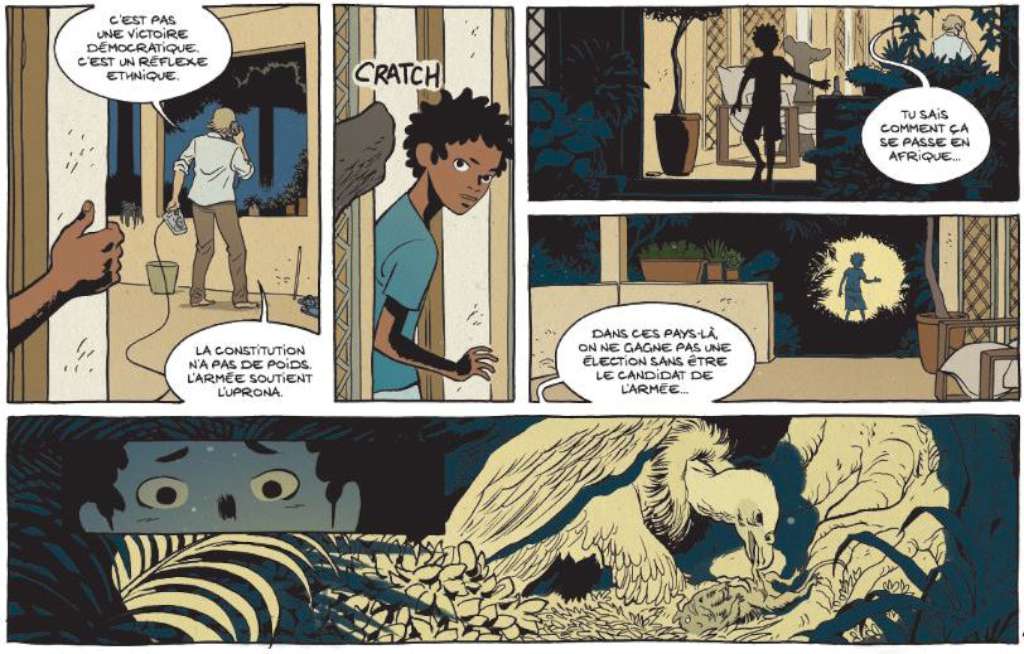 Et c’est amusant parce que je n’en avais pas parlé avec Gaël et quand l’album est sorti, qu’il a eu l’album entre les mains, et qu’il l’a vraiment feuilleté fini avec les couleurs, il a été très touché par cette séquence. Il m’a dit que c’est la séquence qui lui avait pris le plus de temps, il se rappelle du moment où il l’a écrite chez lui à Kigali, il se rappelle de la musique qu’il écoutait et donc ça c’était vraiment un moment particulier ; on s’est retrouvés assez connectés par cette séquence-là. Donc je suis assez content qu’elle soit en couverture et qu’elle représente ce moment.
