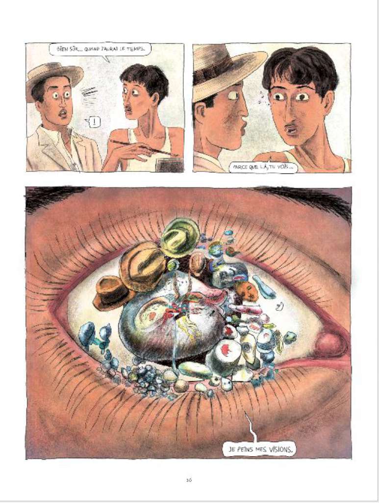 Mais Oubrerie se livre aussi à un travail de collage et d’évocations surréalistes pour donner à voir la psyché et l’art de l’artiste dans des concrétions-créations nouvelles de toute beauté. Dans une demi-page, au tome 2 on voit l’assemblage hétéroclite du « Jeu lugubre » se refléter en gros plan dans l’œil de Dali (référence par ailleurs au plan d’ouverture du « Chien andalou »). Dali y déclare à Bunuel « je peins mes visions ». Oubrerie quant à lui dessine lui ses visions des visions de l’artiste dans une réflexion (reflet) métalinguistique et c’est du grand art !