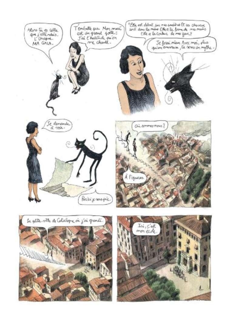 Si Fernande Olivier était la narratrice de « Pablo », le chat Méphisto aux longues moustaches effilées va devenir celui de « Dali ». Dans l’ouverture du premier tome, il sert de guide à Gala pour l’emmener à la découverte de l’enfance et des années d’apprentissage de l’artiste dans un long flash-back.