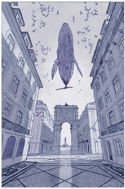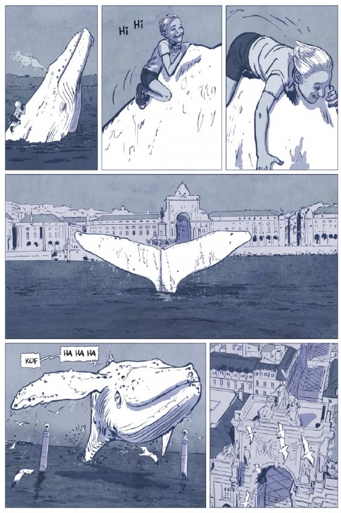 Et puis, et puis, il y a la ville de Lisbonne, personnage à part entière, sa lumière particulière, son atmosphère. Représentée dès la couverture sur une frise d’azulejos, ces carreaux de faïence décorés typiquement lusitaniens, elle envahit l’album : Le Bairro Alto, quartier plutôt bourgeois où réside le docteur, l’Avenida da Liberdade avec ses pavés noirs et blancs si caractéristiques de la capitale portugaise,