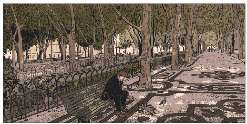 Cette précision quasi photographique ancre l’histoire dans le réel et en fait jaillir toute sa puissance qui sera encore renforcée par le choix des couleurs restituant admirablement l’ambiance toute particulière qui régnait dans la capitale portugaise en soulignant le contraste entre la clarté et la luminosité du soleil qui inondait la ville et le côté sombre de la dictature qui partout y projetait son ombre. Outre le travail sur la lumière, Nicolas Barral, secondé pour la mise en couleurs par sa fille Marie, a su donner une cohérence entre les deux périodes sur lesquelles se déroule le récit en les inscrivant toutes deux dans une atmosphère de nostalgie aigre-douce, passant sans rupture des tons sépia des flash-back aux couleurs du présent par le biais d’une palette de teintes désaturées à dominante d’ocres.