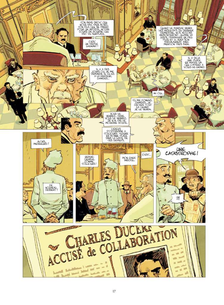 Comme souvent avec Dorison, le récit bénéficie d’un substrat historique. Ici, l’élément perturbateur est la période de l’épuration d’emblée questionnée par les auteurs : car les motifs des accusateurs de M. Ducerf sont peut-être moins nobles et plus mercantiles qu’il n’y paraît : il s’agit moins de laver l’honneur de la France que de trouver un prétexte pour nationaliser une entreprise florissante…