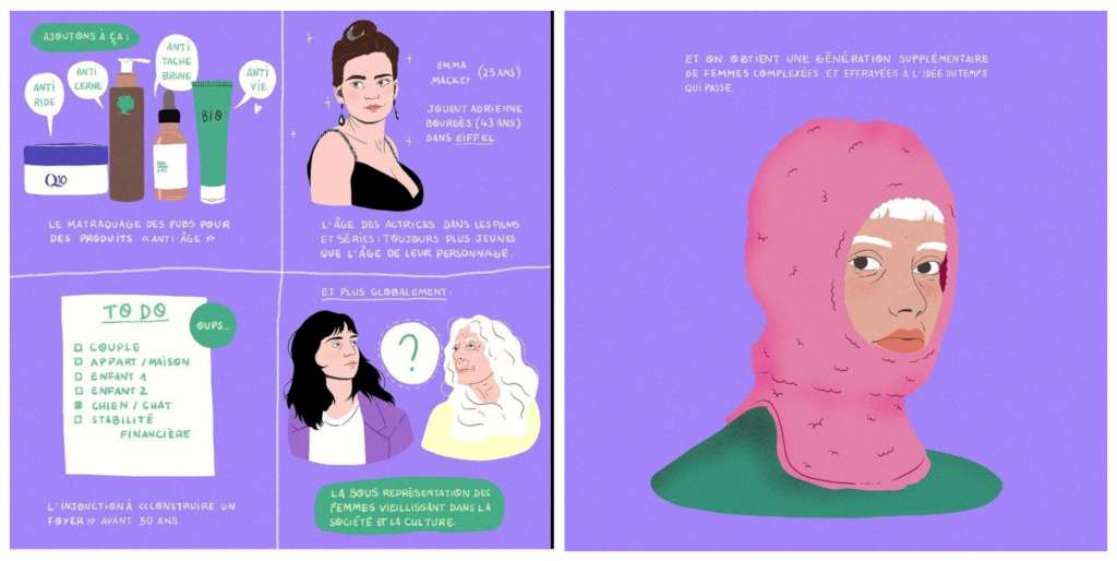 Plus tard me suis trouvé une petite histoire qui allait avec : ma nouvelle idée pour expliquer le choix de « cheveu blanc » c’est l’image qu’on a des femmes et du fait de porter les cheveux blancs. Je trouve que c’est quelque chose de très empouvoirant et très féministe le fait de ne pas se teindre les cheveux. Dans ma famille toutes les femmes ont toujours eu les cheveux teints et les hommes ont toujours eu les cheveux gris et ne se sont jamais teint les cheveux. Je trouvais que prendre le contrepied c’était intéressant et j’ai beaucoup dessiné de femmes avec les cheveux blancs.