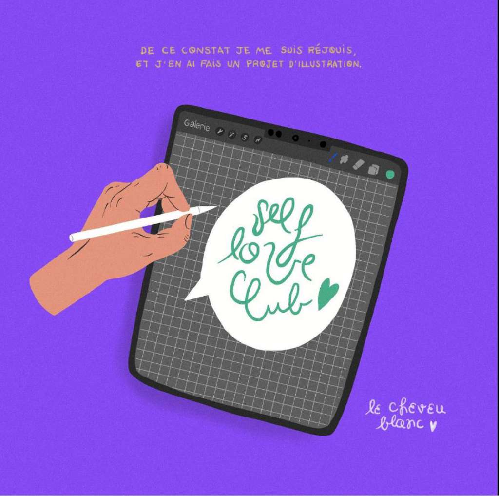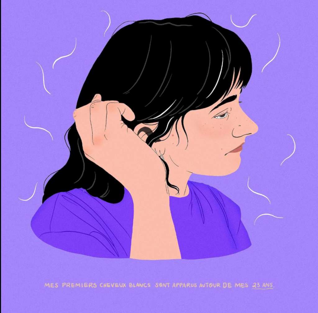 J’ai toujours été dans l’artistique. Après le collège je suis partie en bac arts appliqués puis j’ai fait un BTS en design de communication et après une licence en graphisme. Je n’ai jamais trop touché à l’illustration avant la fin de mes études et j’ai arrêté mes études avant la fin d’ailleurs car ce n‘était pas trop fait pour moi … et le projet de « Cheveu blanc » il est né à ce moment-là, quand j’ai arrêté mes études pour faire une petite pause et que je me suis pas mal cherchée en faisant des petits boulots alimentaires. Je ne savais pas vraiment où je voulais aller mais en tout cas les boîtes de com classiques ça ne m’intéressait pas vraiment … Puis j’ai commencé à m’intéresser beaucoup aux questions féministes, à m’engager aussi en tant que militante, et à avoir envie de faire quelque chose avec ça.