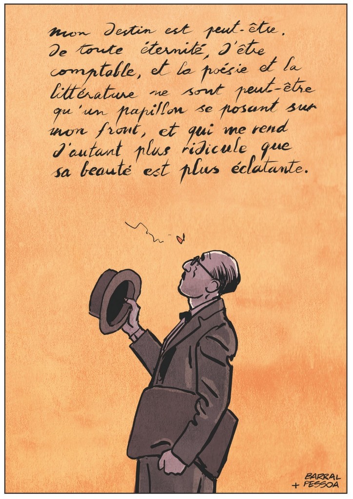 Dès la couverture on est intrigué par ce papillon orange posé sur la joue de Pessoa. Au cours du récit, on va voir les papillons qui vont peu à peu envahir son univers. Les papillons … belle métaphore visuelle pour évoquer les hétéronymes et matérialiser la présence des amis imaginaires de Pessoa.