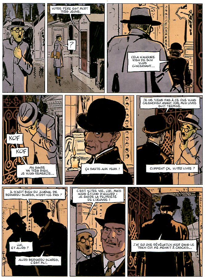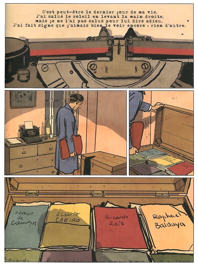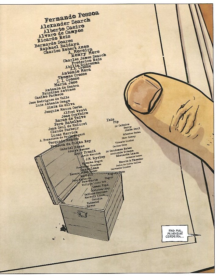 Nicolas Barral nous offre là un beau jeu de miroirs car si le jeune journaliste menant l’enquête pas à pas est un peu le double de l’auteur parti lui aussi à la recherche de Pessoa dans la genèse de l’album, par ricochet c’est également celui du lecteur qui va s’identifier à lui en avançant au même rythme.