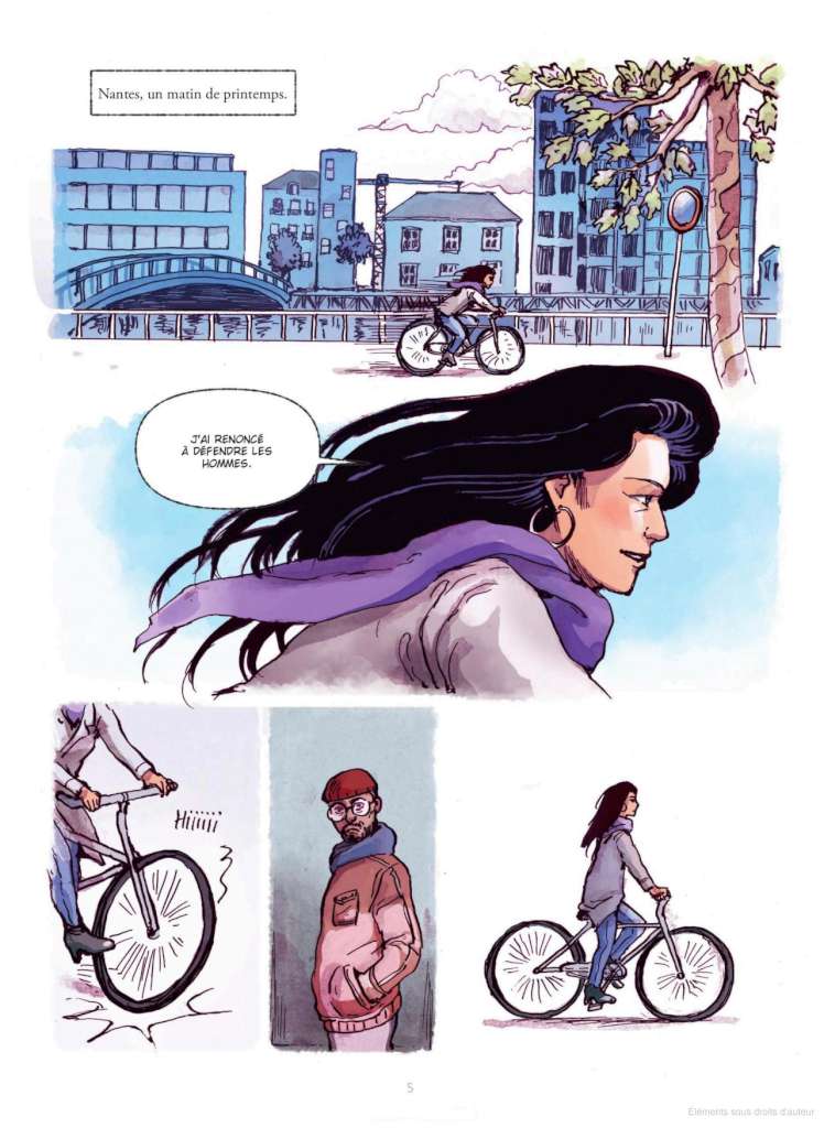 On suit donc tambour battant Anne Bouillon au gré de ses pérégrinations. Elle se déplace dans Nantes à vélo à vive allure, court pendre un train pour Paris, se rend à Montpellier … bref sillonne inlassablement la France pour épauler celles qui ont besoin d’elle. On la voit aussi avec son équipe dans son cabinet et plaider lors de différents procès. Certaines plaidoiries sont retranscrites de même que la lettre qu’elle écrivit à l’actrice Adèle Haenel pour saluer son action courageuse. Parfois elle s’adresse au lecteur « face caméra », parfois elle dialogue avec ses collaborateurs ou s’entretient avec ses clientes. Pour se détendre, elle continue à bouger puisqu’elle court ! Hyperactive, elle ne s’arrête jamais. C’est un portrait en action, cheveux au vent, dans des séquences reconnaissables à leurs dominantes chromatiques de bleu et violet …
