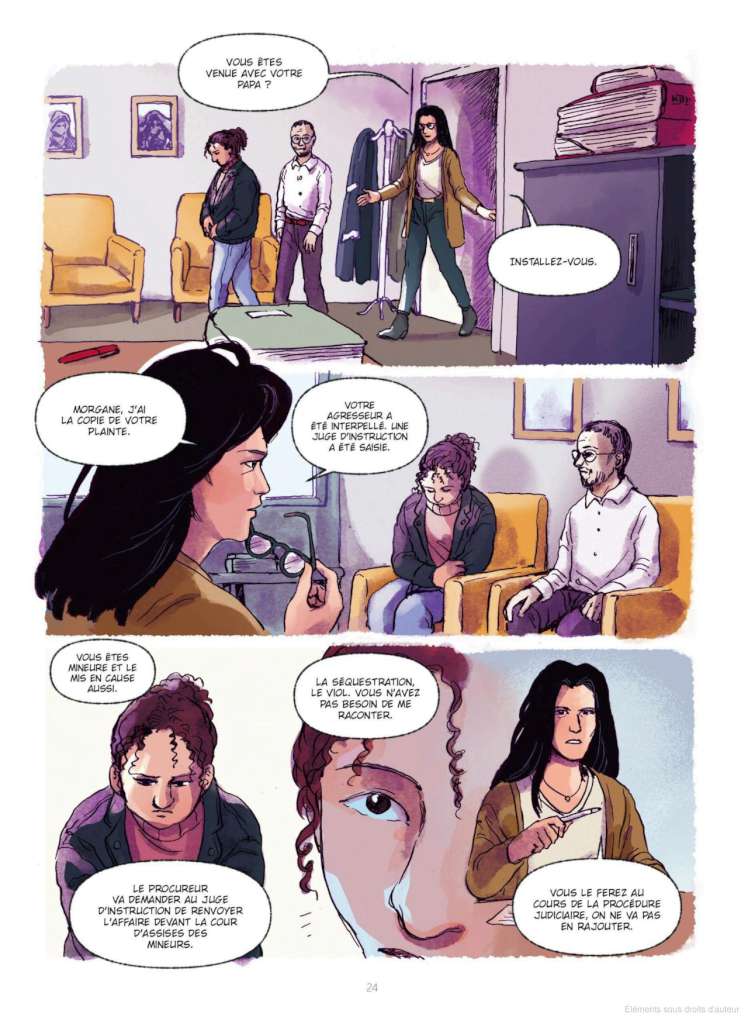 Pourtant il ne s’agit pas d’un clip publicitaire à la gloire d’une avocate photogénique ; les autrices résistent à la tentation hagiographique. L’Anne Bouillon qu’elles nous présentent n’est pas une sainte, loin de là : elle apparaît parfois goûter un peu trop les plateaux TVs et un peu grisée lorsqu’elle contemple son portrait pleine page dans « Libé ». Si grâce à la bande dessinée on perçoit le quotidien d’un avocat, l’essentiel est ailleurs : évoquer les femmes et les violences qu’elles subissent.
