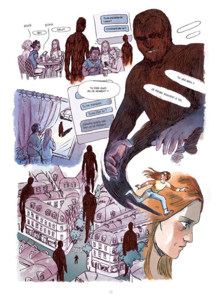 Et ce sont ces sentiments – prise de conscience et révolte- que les autrices cherchent alors à susciter auprès du lecteur. Pour cela elles favorisent l’identification. Ainsi, elles matérialisent la peur et l’angoisse d’une femme harcelée en faisant du harceleur une sorte de Golem omniprésent grâce à son ombre gigantesque présentée en contreplongée. La métaphore est saisissante. De même, elles représentent le contrôle coercitif exercé par un des conjoints sous la forme d’une mise en boîte ou bien l’anamnèse traumatique d’un viol conjugal par des cases hexagonales éclatées comme des fragments de vitre.