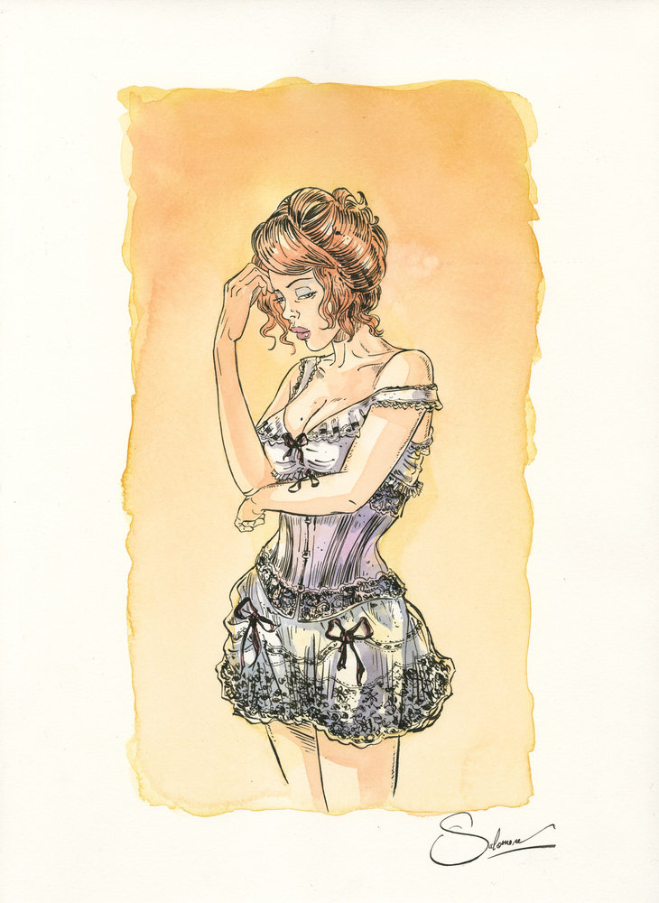 Le dessinateur a ainsi décidé de l’époque – fin des années 50 – et du lieu : un magasin de lingerie. Il faut dire que dès « L’homme qui n’aimait pas les armes à feu » on avait remarqué que Salomone c’était plutôt « l’homme qui aimait les femmes ». Au fil des planches nous admirions une Margaux plus ou moins vêtue et moults guêpières et corsets. L’effeuillage fut encore plus systématique dans le poétique « Des plumes & Elle » où, seul aux commandes, il évoquait un peintre qui capturait l’image des belles de nuit…