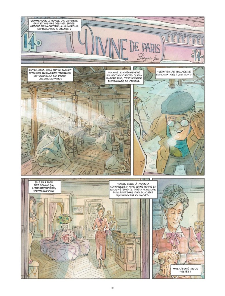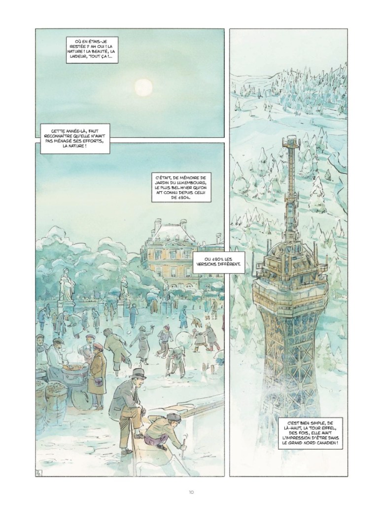 On lui découvre également un talent pour les paysages urbains. Certaines planches sont une variation au fil des saisons (l’introduction et la conclusion au jardin des Tuileries par exemple), les décors sont fouillés, qu’il s’agisse de Neuilly, du Champ de Mars ou du Golfe Drouot tandis que les arrières plans fourmillent de détails. On se perd avec délice dans ses planches.