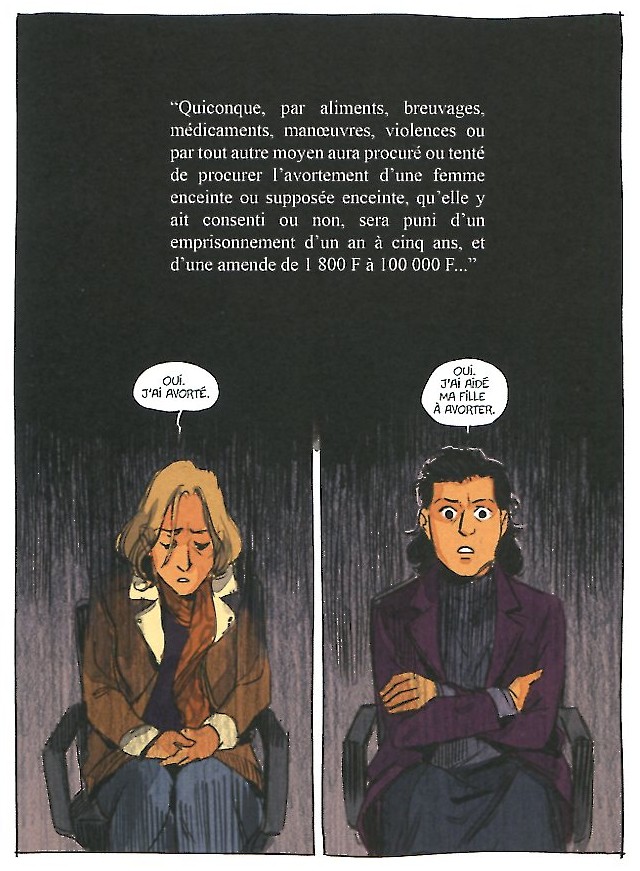 (rire) Ah je regrette que la scénariste ne soit pas là. Elle est beaucoup plus bavarde que moi. À la base c’est Marie qui a eu l’idée, Marie Bardiaux-Vaïente qui est scénariste de bd, historienne. C’est une passionnée d’histoire de la justice. À la base, elle est militante pour l’abolition de la peine de mort. Elle a travaillé là-dessus. Elle a fait plusieurs albums – deux, je crois – sur la thématique et de fil en en aiguille elle s’est rendu compte, c’est tout naturel qu’il fallait qu’elle travaille sur ce procès Bobigny. Ce qui l’intéressait, ce n’était pas forcément de travailler sur la figure emblématique de Gisèle Halimi mais plutôt de recentrer le récit sur Marie-Claire et Michèle Chevalier qu’on ne connaît pas si bien que ça en fait. On connaît très bien Gisèle Halimi. C’est vrai que nous, ce qui nous intéressait, c’était cet angle-là. C’était la vie de ces deux femmes et de voir comment d’une dimension on va dire qui est de l’ordre de l’intime et du familier – parce qu’elles nous ressemblent ces deux femmes, en tout cas, moi, elles me ressemblent beaucoup – on pouvait basculer dans une dimension historique, politique …