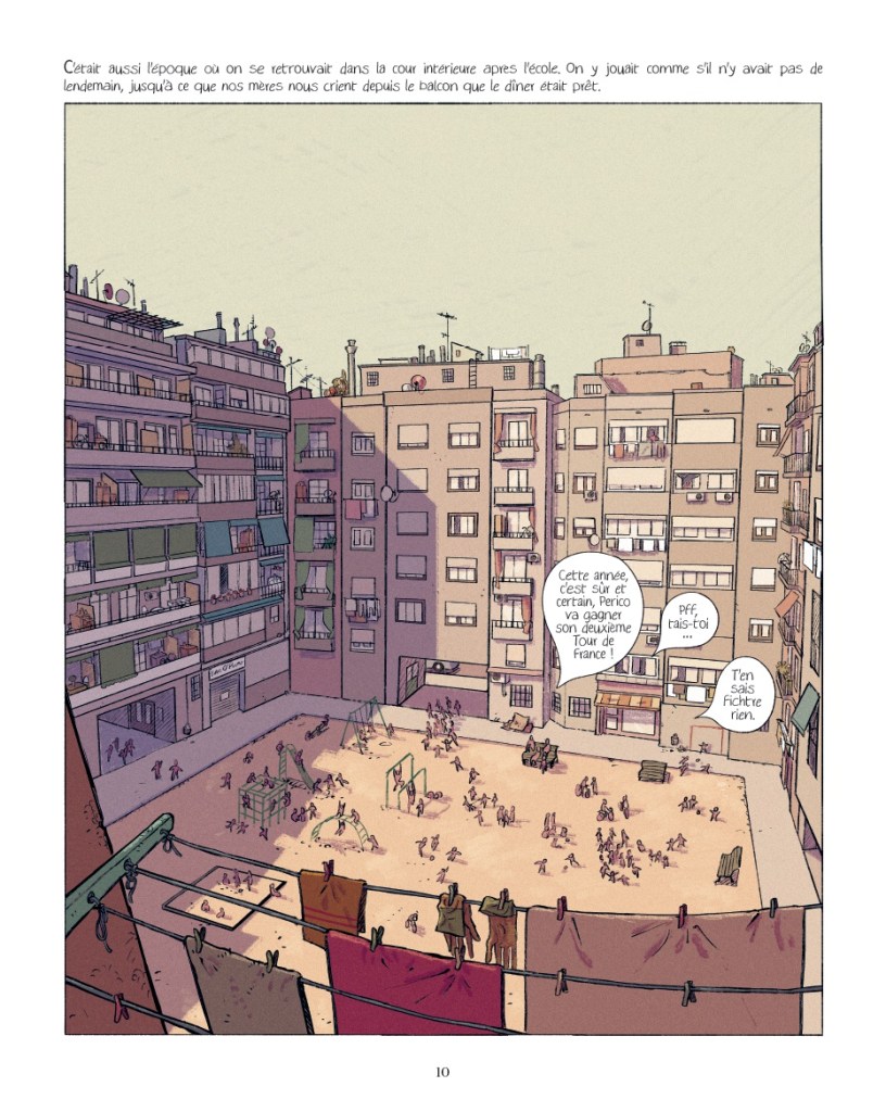 À Sant Pere, dans les années 90, tout semble figé. On rêve de la grouillante et inconnue Barcelone, inatteignable, et pourtant à quinze minutes en train seulement. Les gamins du quartier vivent dehors et égrènent le temps en courant derrière un ballon sur les terrains. Dans quelques années – ils savent qu’ils n’y échapperont pas – , ils viendront grossir les rangs des usines et des entrepôts de la zone industrielle. Ce qui ne les empêche pas de rêver, pour le moment, vibrant lors des matchs des vacances ou devant le Tour de France. Cette année-là, alors qu’Indurain montre des faiblesses pendant sa course, Carlos, 12 ans, rencontre Bebeto, un adolescent au corps étrange, disproportionné, maladroit. Tout le monde l’appelle comme ça, sans connaître son véritable nom. Pourquoi semble-t-il être bloqué à une étape de la vie qu’il aurait dû fuir depuis longtemps ? Carlos, comme les autres, n’essaye pas vraiment de le comprendre, trop pressé de quitter le monde de l’enfance pour entrer dans celui des adultes. Pourtant, cette amitié étrange et fugace pourrait bien être de celles qui changent tout. Ce sont ses souvenirs de jeunesse qui ont inspiré à Javi Rey l’histoire d’On l’appelait Bebeto, son premier roman graphique en tant qu’auteur complet. Mais ce récit est avant tout une fiction personnelle, singulière et lumineuse.