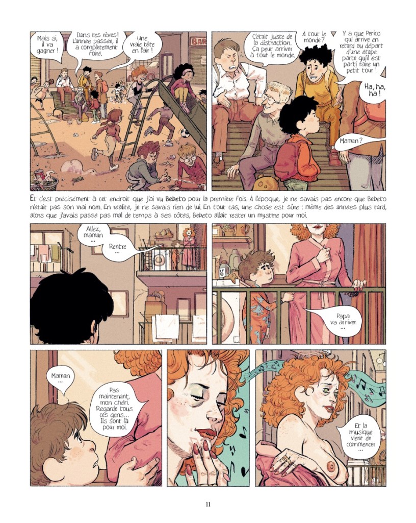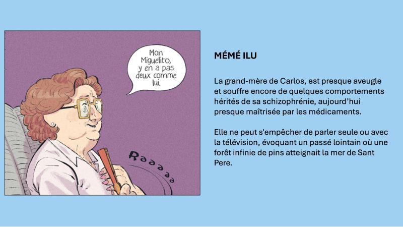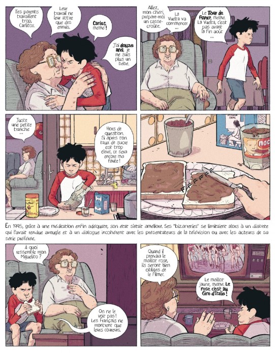 Mémé Ilu, le personnage le plus proche de la réalité, est inspirée de sa propre grand-mère qui elle aussi était atteinte de schizophrénie dans sa jeunesse et parlait avec la télévision. Cette relation entre Carlos et sa grand-mère qui est un peu celle qu’il a connue lui-même ponctue tout le récit et va avoir pour point d’orgue une scène extrêmement touchante lorsque Carlos se fait commentateur du tour … une façon pour l’auteur de rattraper par la fiction le temps perdu et de combler un manque …
