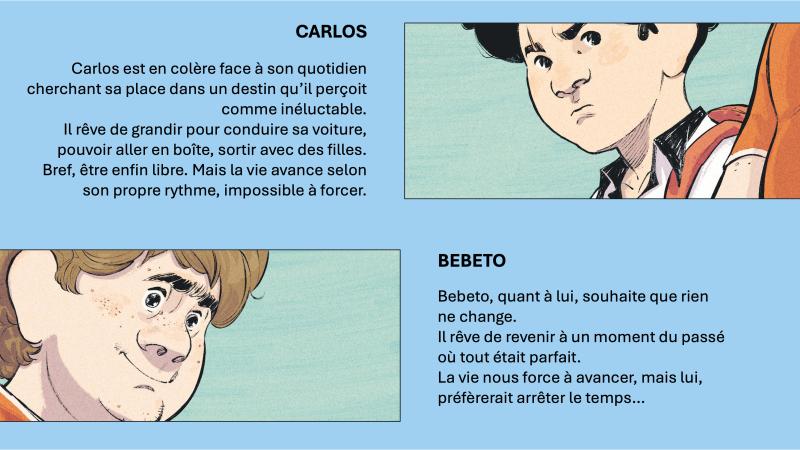 Là, il est seul aux manettes en signant également le scénario. Ça faisait longtemps qu’il voulait raconter ses propres histoires. Cette histoire de Carlos et Bebeto qui puise ses racines dans sa propre jeunesse, ça faisait longtemps qu’il y songeait. Depuis une dizaine d’années déjà, il s’était mis à écrire de courts récits en relation avec cette histoire. L’un brossait le portrait de Bebeto. Un autre parlait de la relation entre un petit frère et un grand frère et la sensation du petit frère quand le grand frère n’a plus envie de rester avec lui au moment de l’adolescence … Il ne lui restait plus qu’à les assembler. C’est maintenant chose faite.